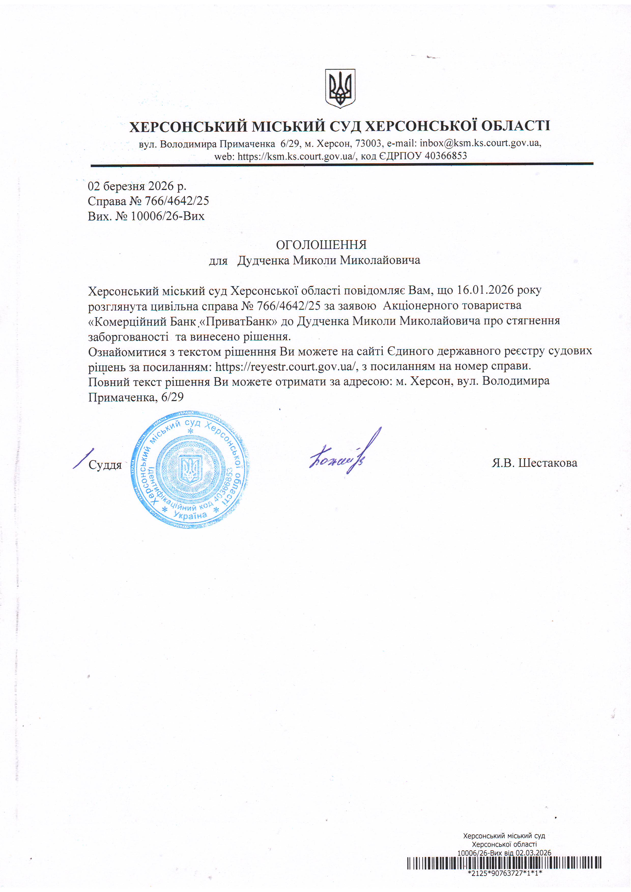 Оголошення для Дудченка Миколи Миколайовича про винесення рішення