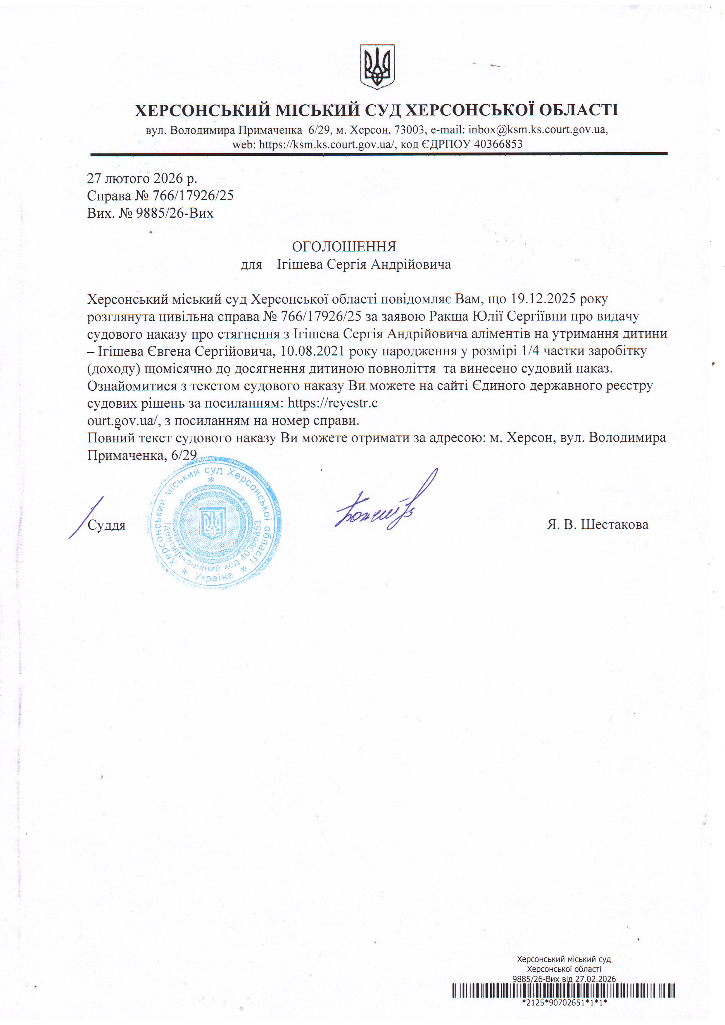 Оголошення для Ігішева Сергія Андрійовича про винесення судового наказу