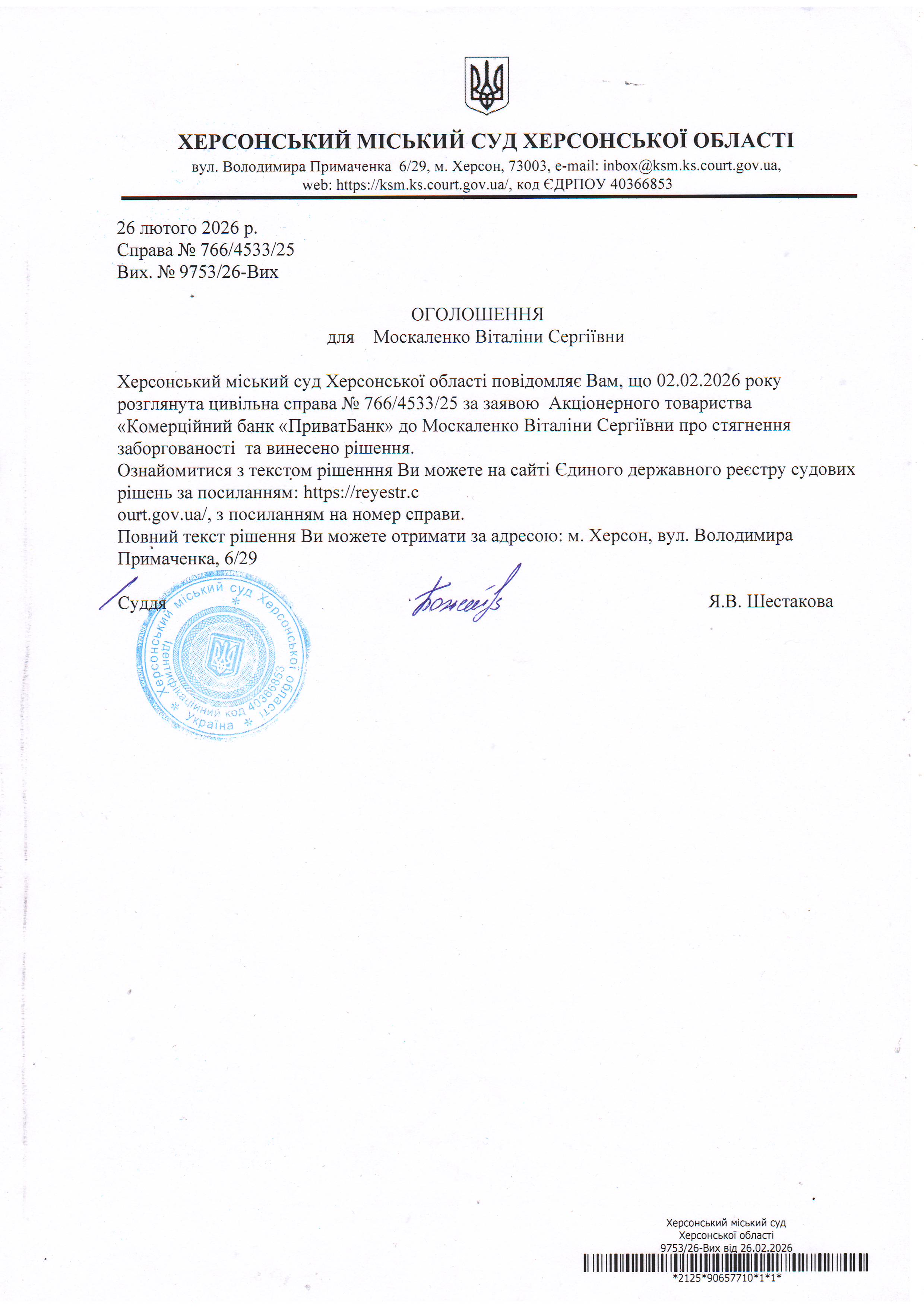 Оголошення для Москаленко Віталіни Сергіївни про винесення рішення