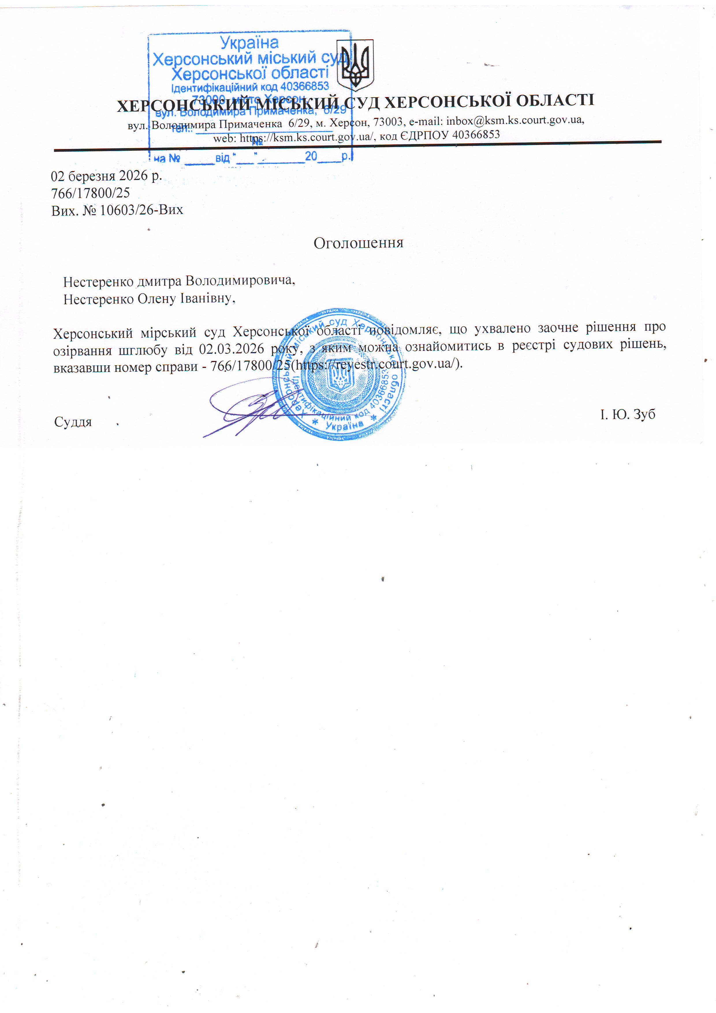Оголошення для Нестеренка Дмитра Володимировича, Нестеренко Олени Іванівни про ухвалення заочного рішення