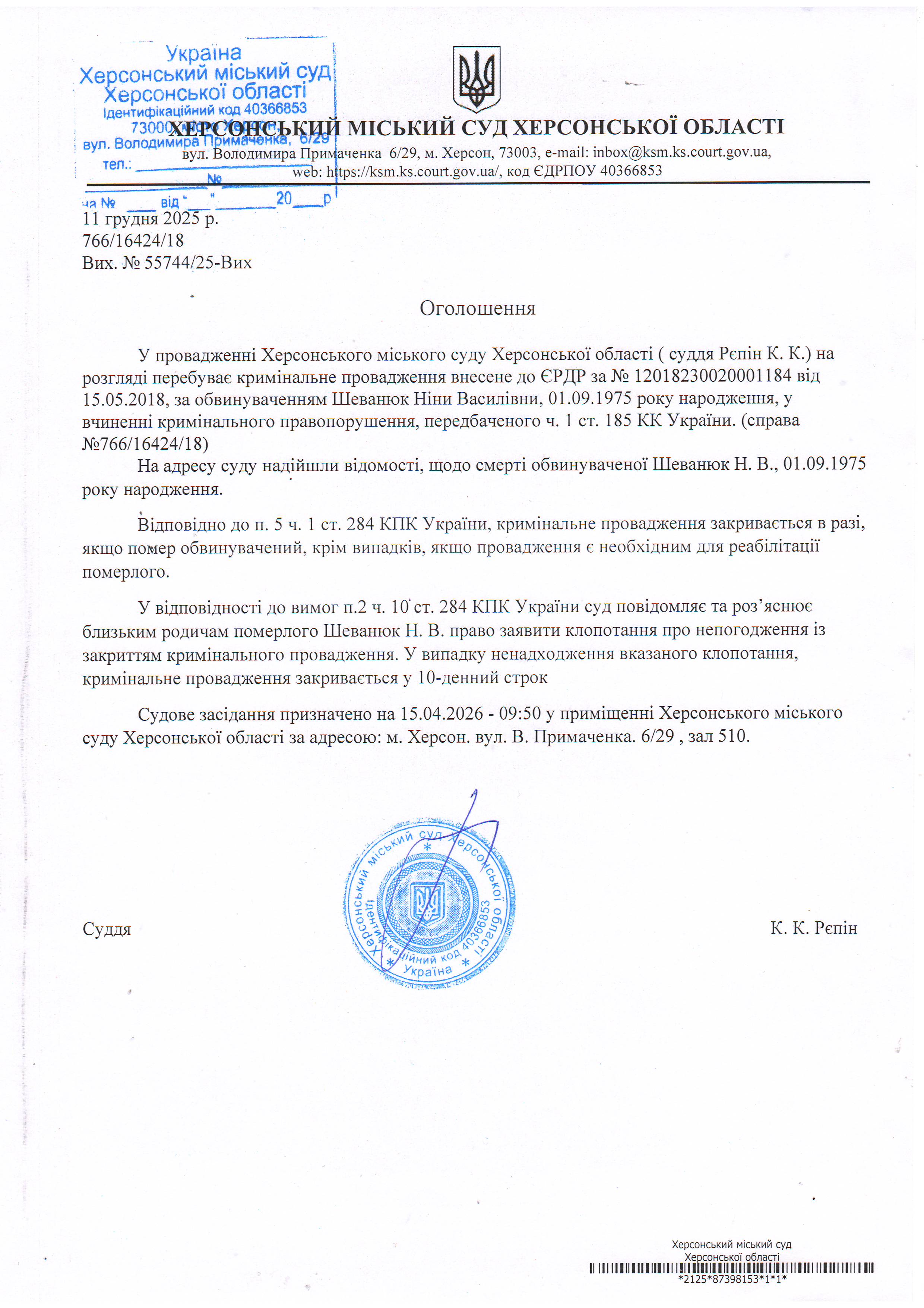 Оголошення про виклик особи в суд та повідомлення про судове рішення