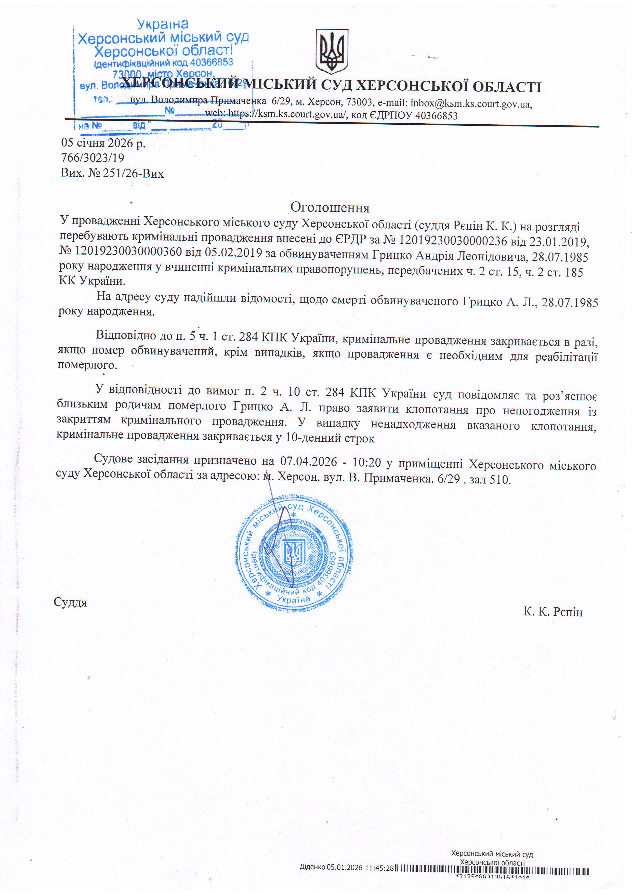 Оголошення про виклик особи в суд та повідомлення про судове рішення