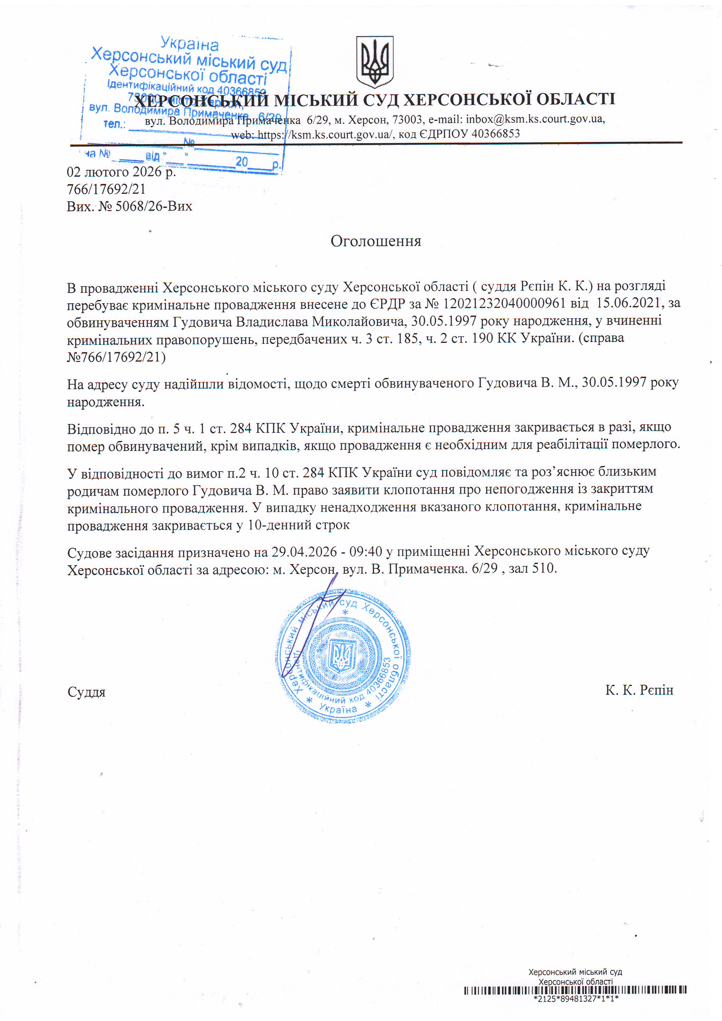 Оголошення про закриття кримінального провадження у відношенні Гудовича Владислава Миколайовича