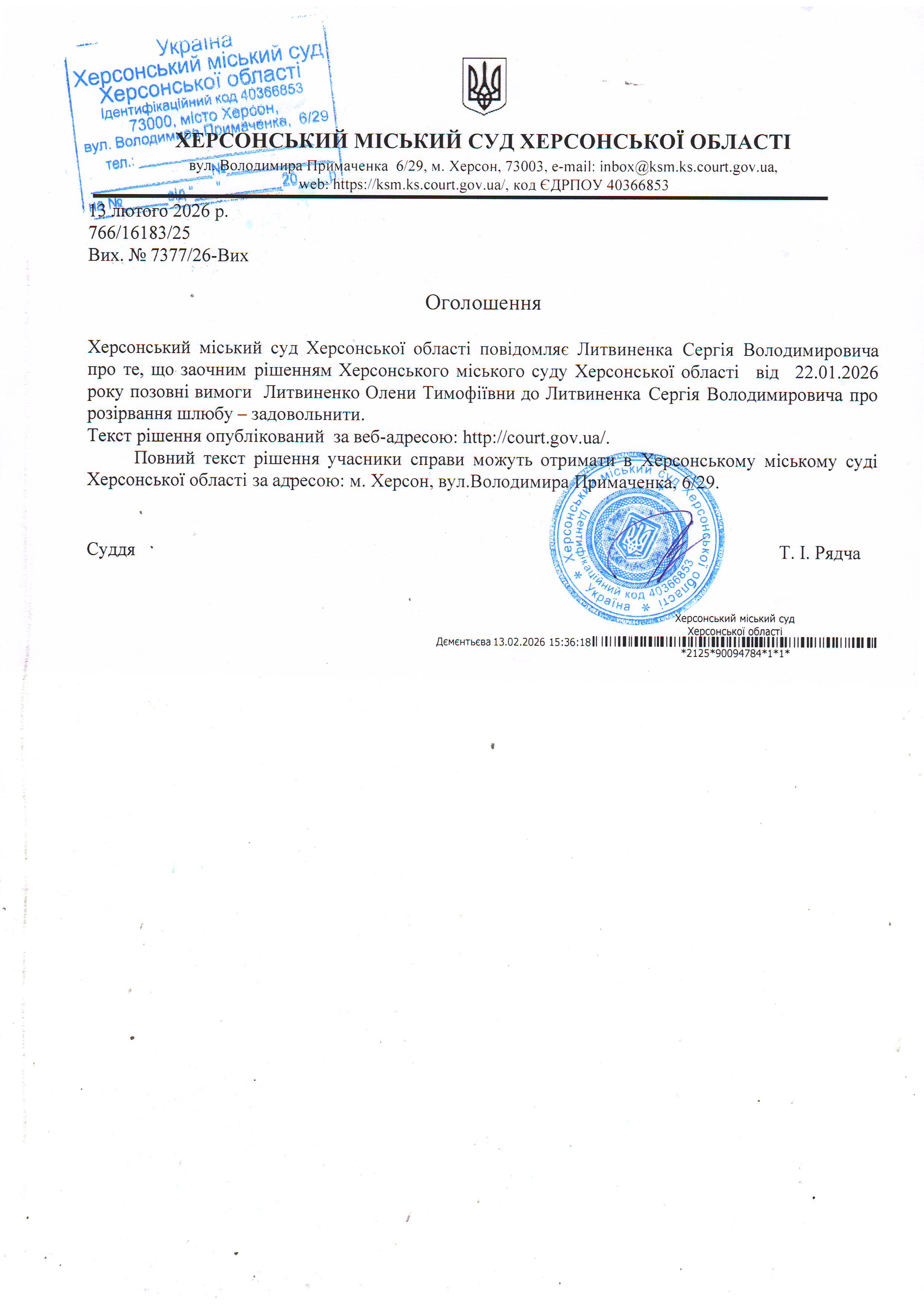 ОГОЛОШЕННЯ, УХВАЛИ ТА ЗАОЧНІ РІШЕННЯ