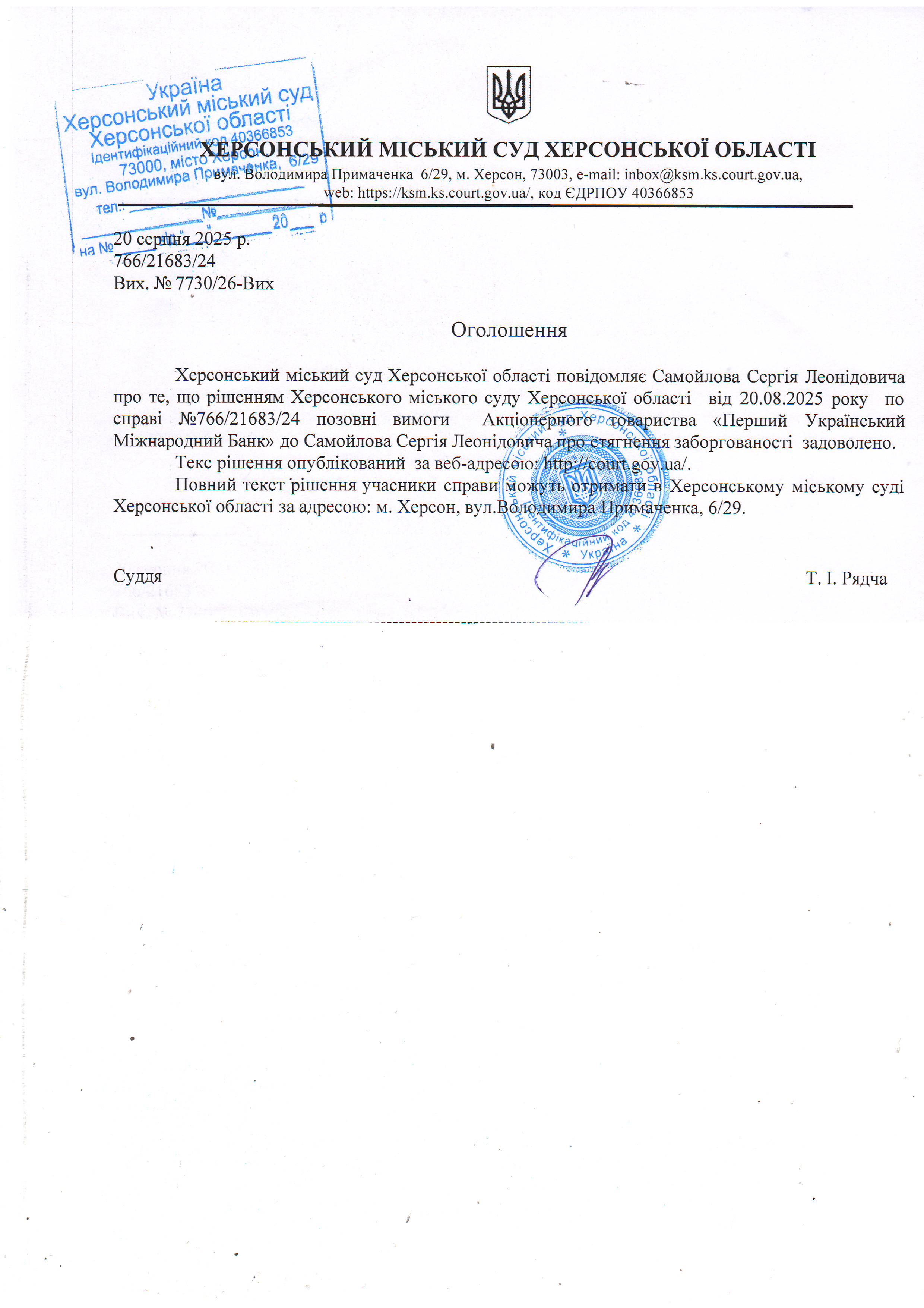 ОГОЛОШЕННЯ, УХВАЛИ ТА ЗАОЧНІ РІШЕННЯ