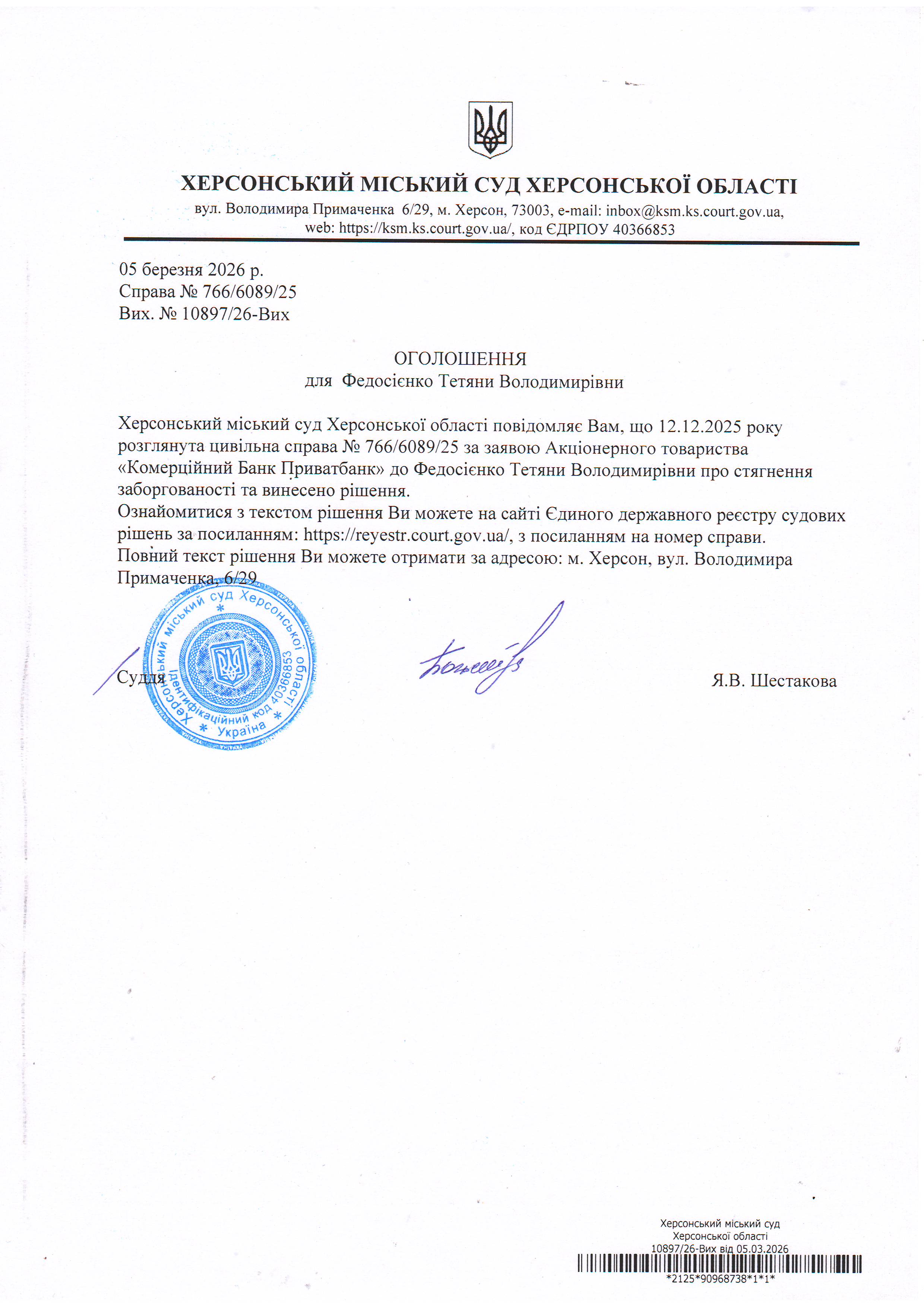 Оголошення про виклик особи в суд та повідомлення про судове рішення