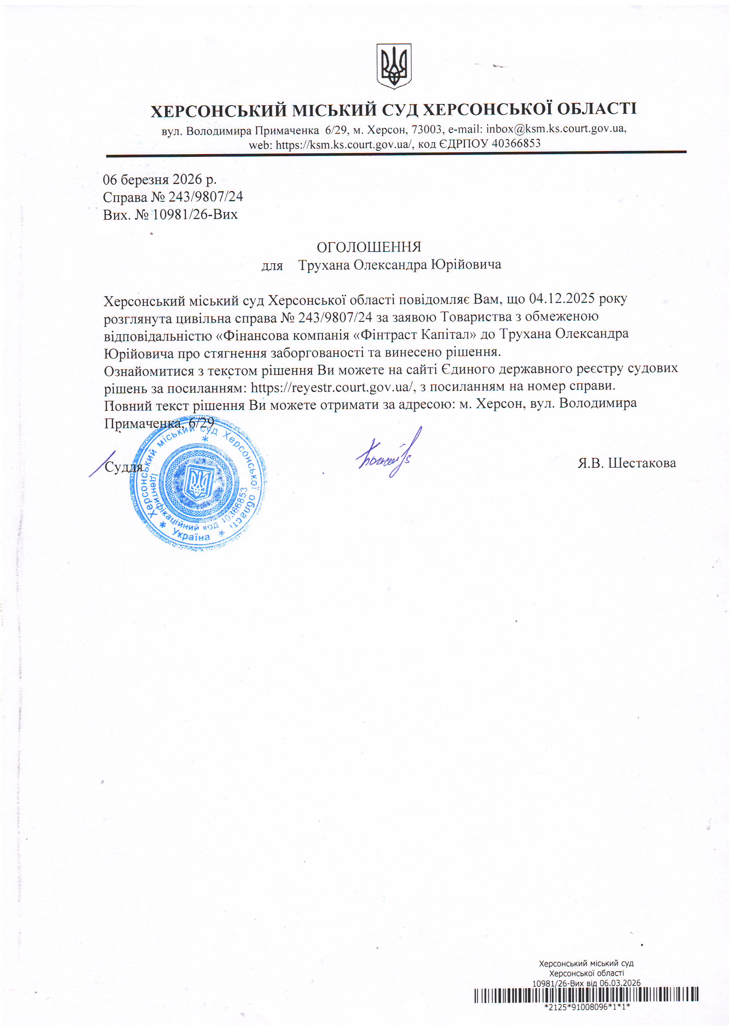 Оголошення для Трухана Олександра Юрійовича про винесення рішення