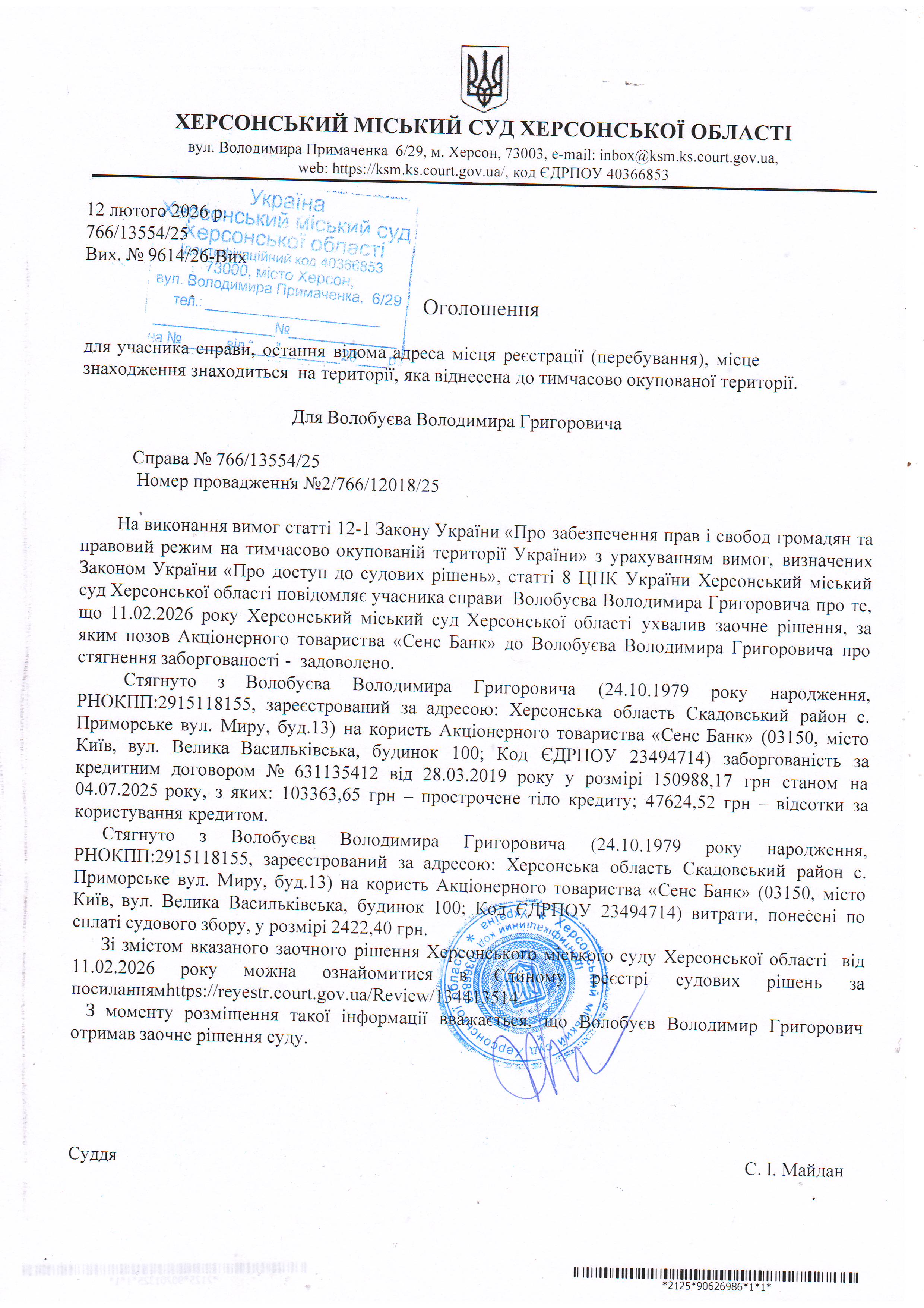 Оголошення для Волобуєва Володимира Григоровича про ухвалення заочного рішення