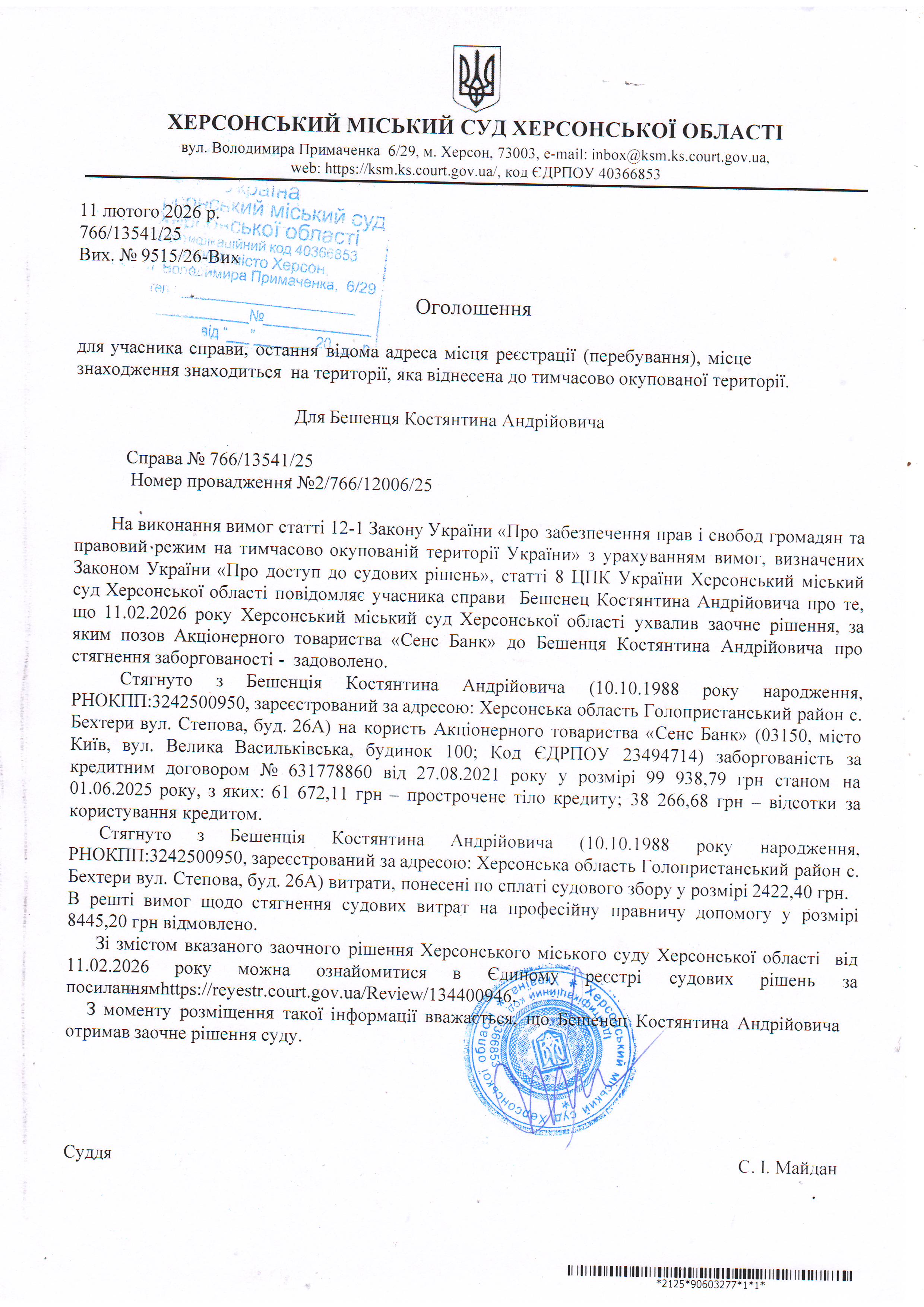Оголошення для Бешенця Костянтина Андрійовича про ухвалення заочного рішення