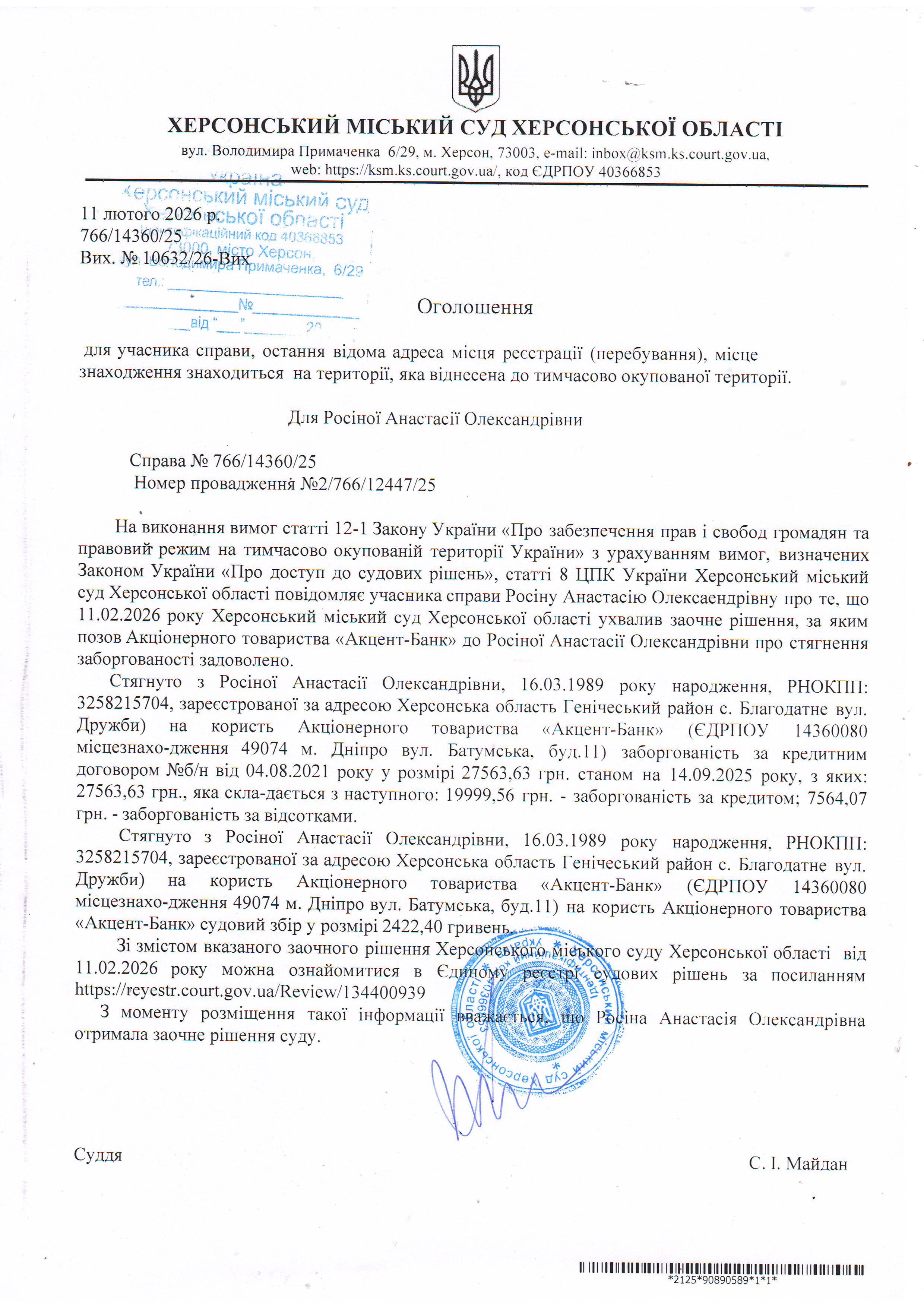 Оголошення для Росіної Анастасії Олександрівни про ухвалення заочного рішення