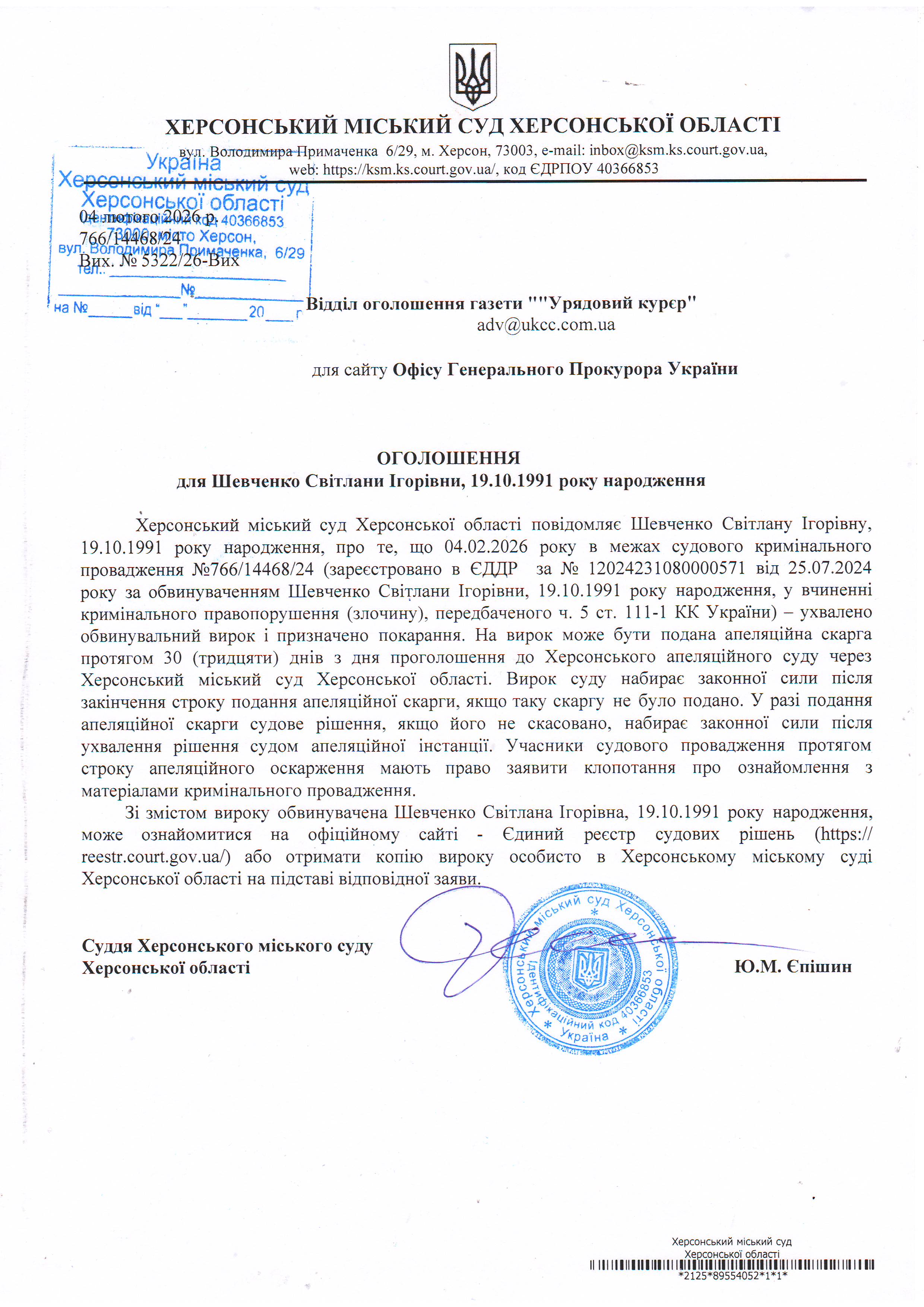 Оголошення для Шевченко Світлани Ігорівни про ухвалення вироку