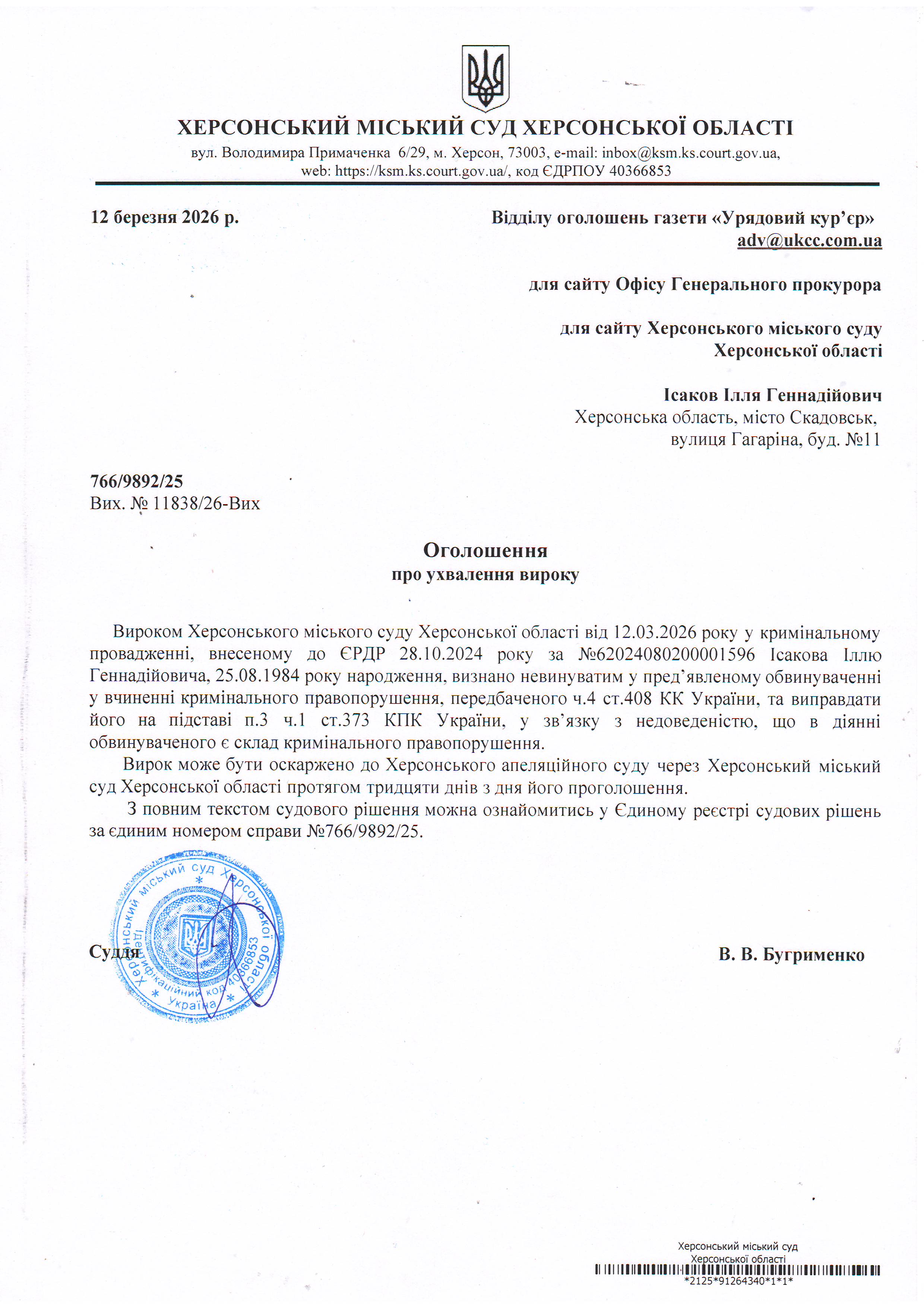 Оголошення для Ісакова Іллі Геннадійовича про ухвалення вироку