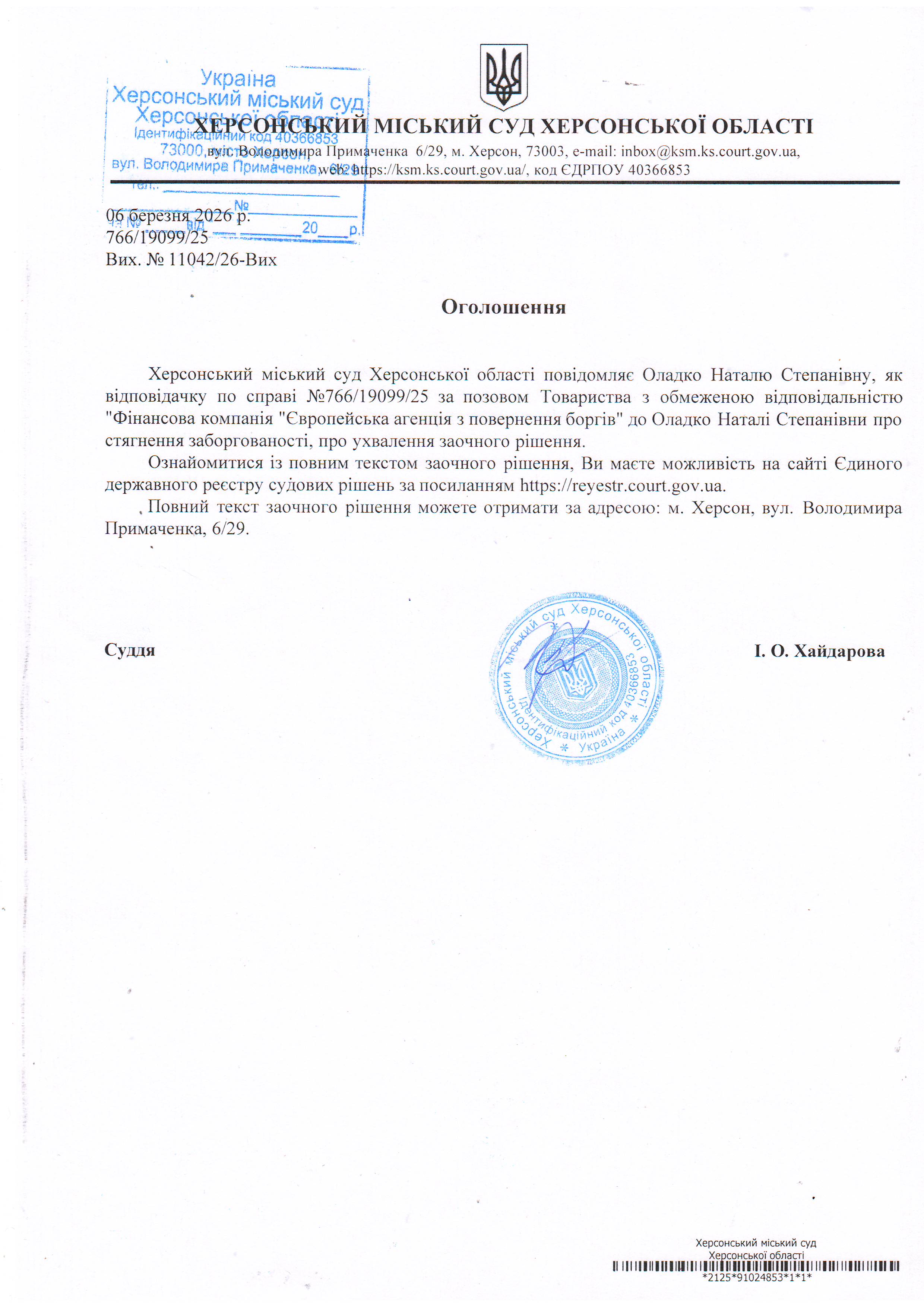 Оголошення для Оладко Наталі Степанівни про ухвалення заочного рішення