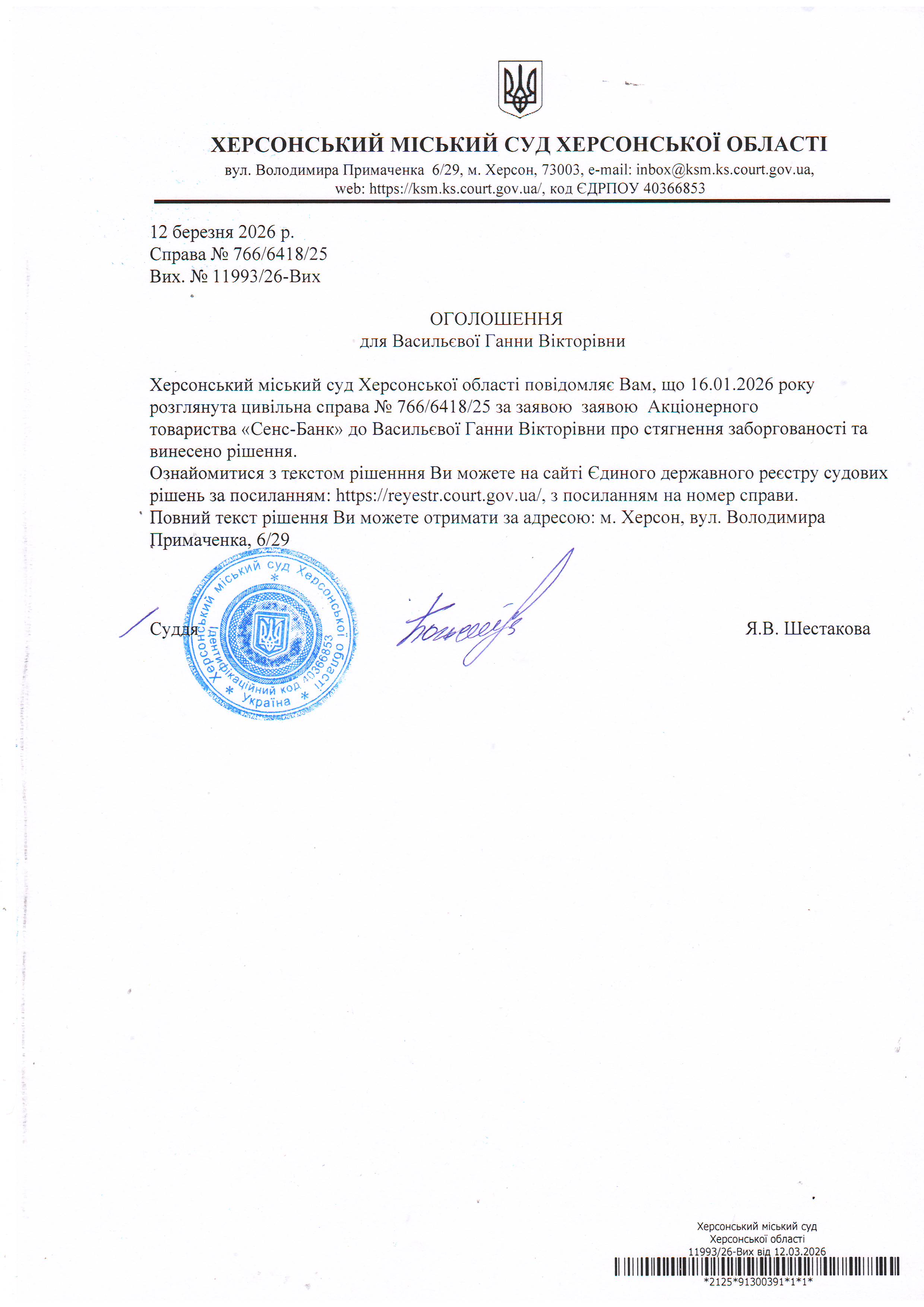 Оголошення для Васильєвої Ганни Вікторівни про винесення рішення