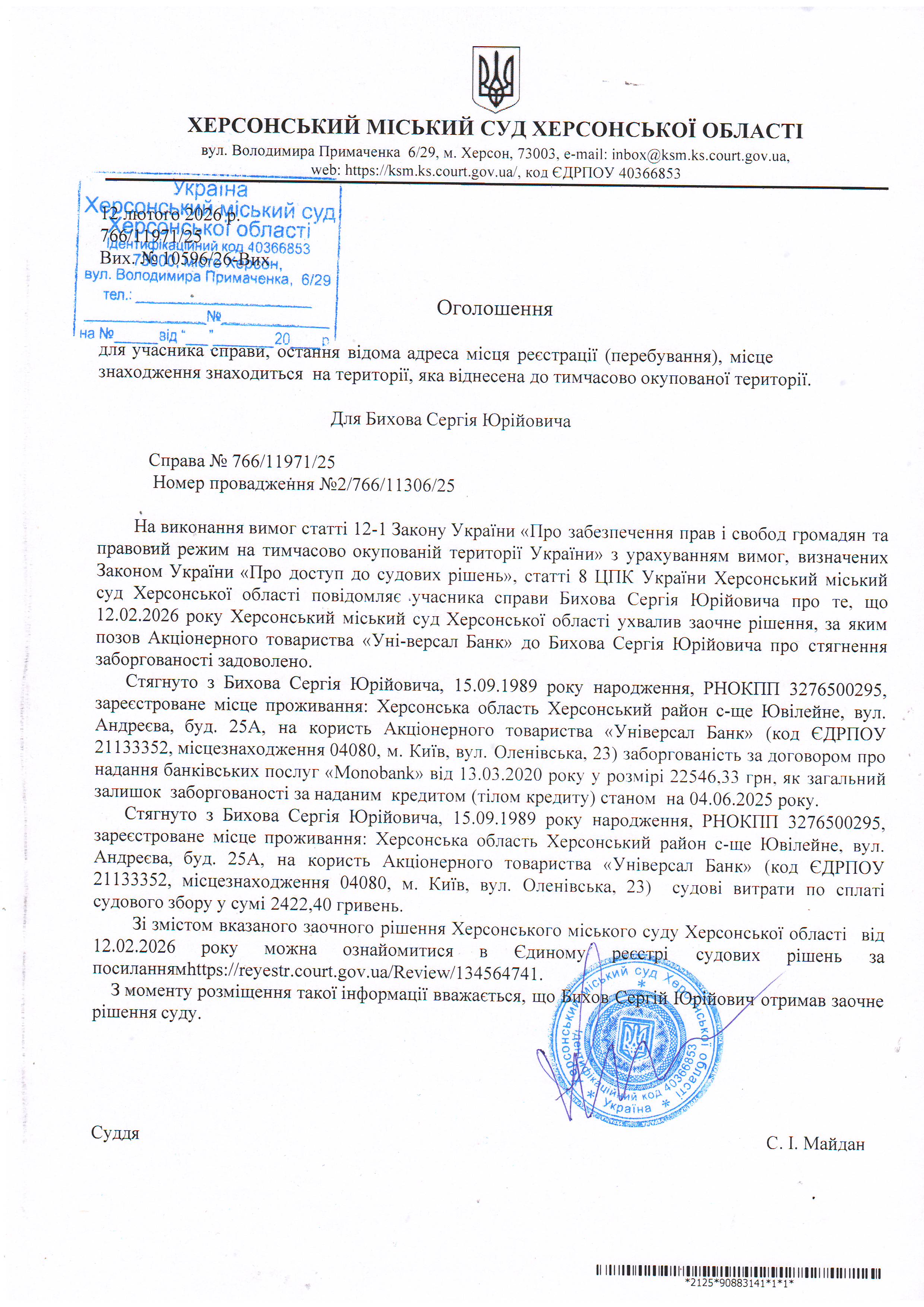 Оголошення для Бихова Сергія Юрійовича про ухвалення заочного рішення