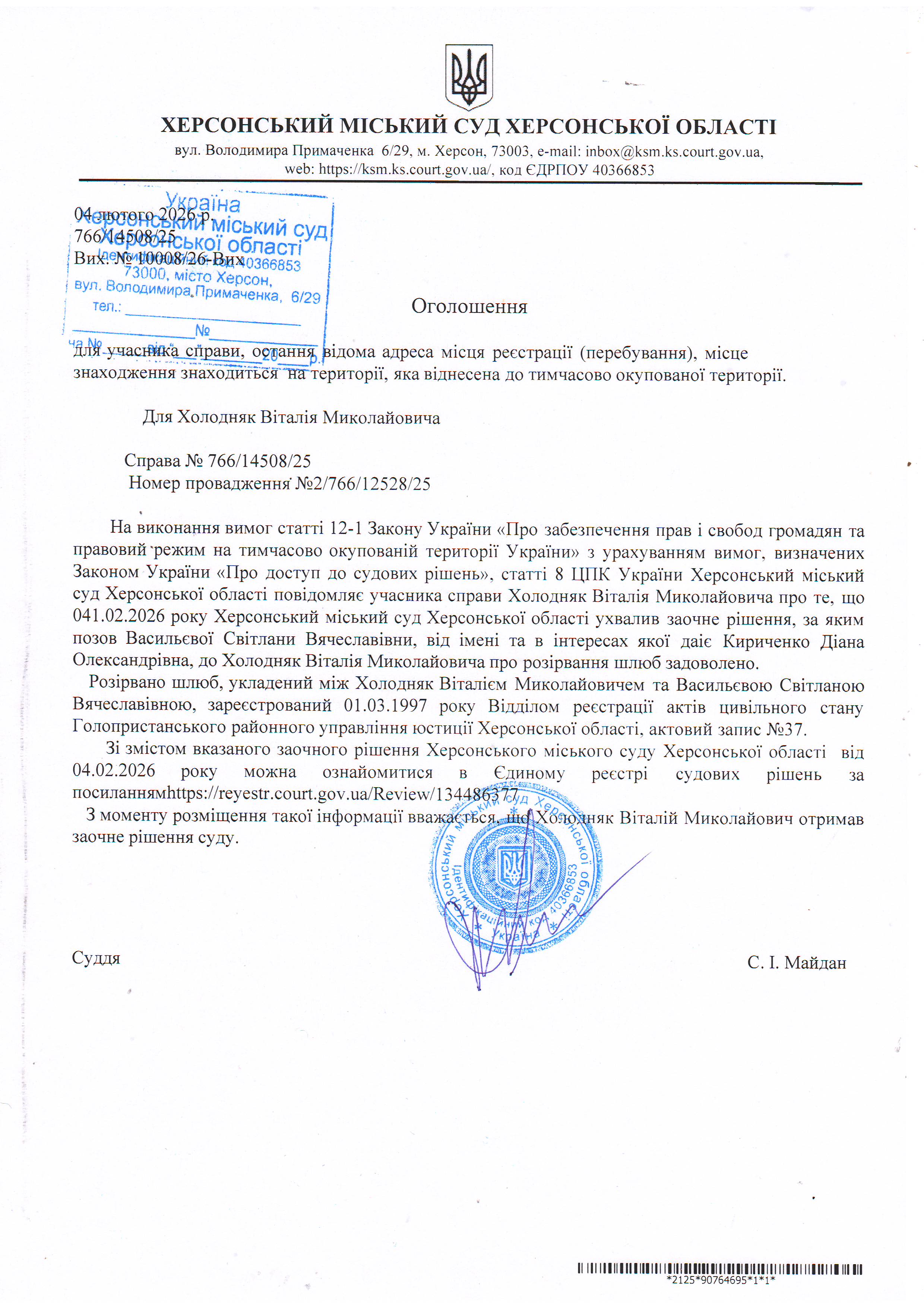 Оголошення для Холодняка Віталія Миколайовича про ухвалення заочного рішення
