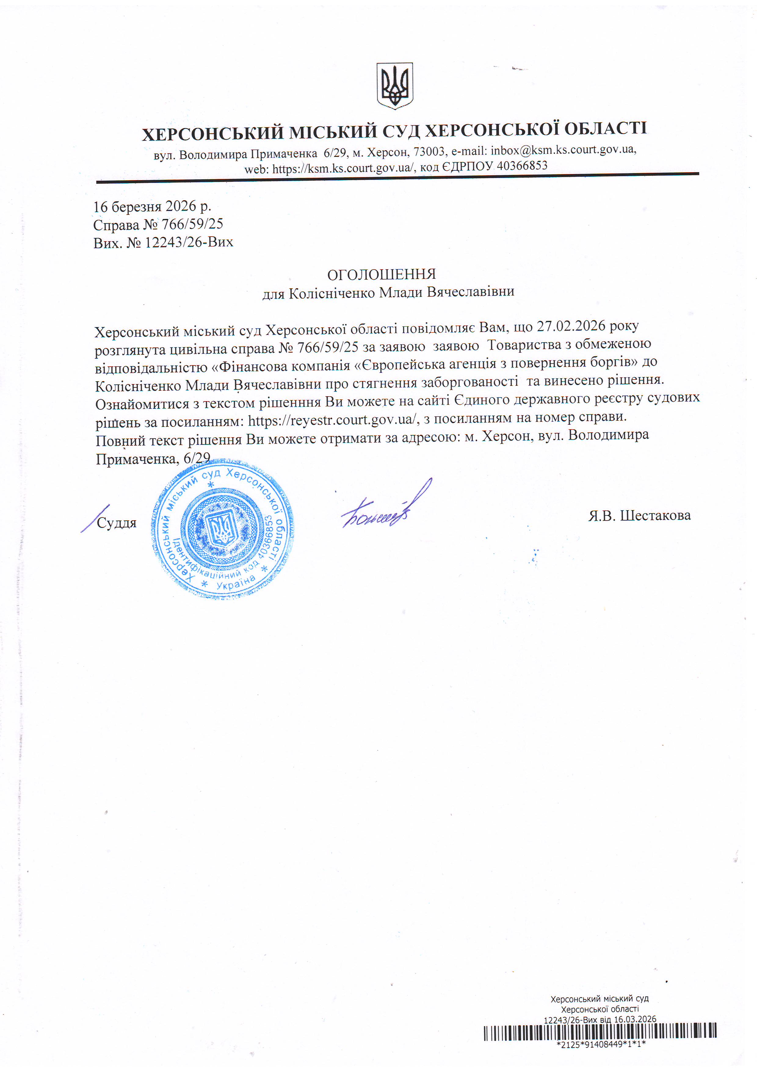 Оголошення для Колісніченко Млади Вячеславівни про винесення рішення