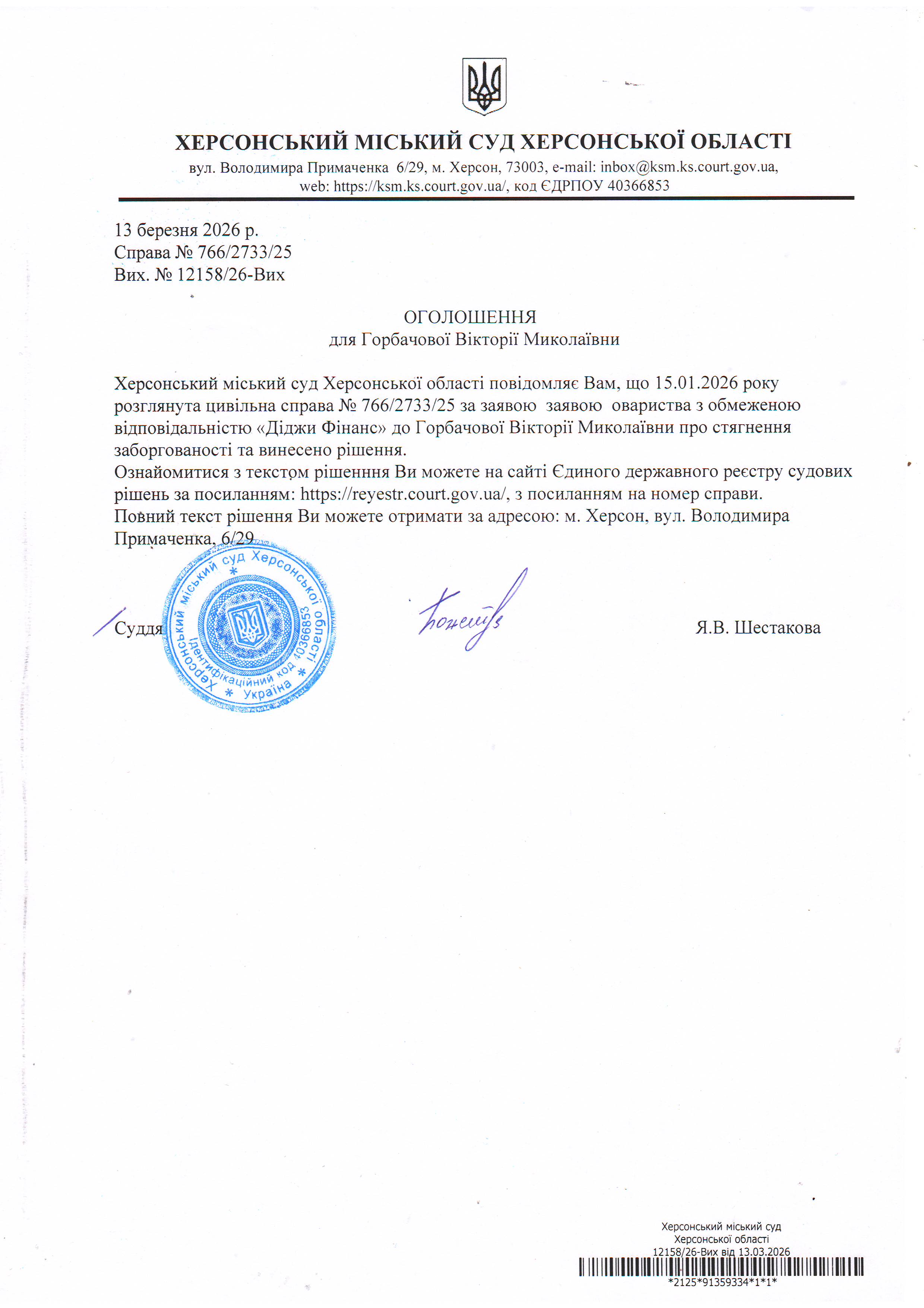 Оголошення для Горбачової Вікторії Миколаївни про винесення рішення