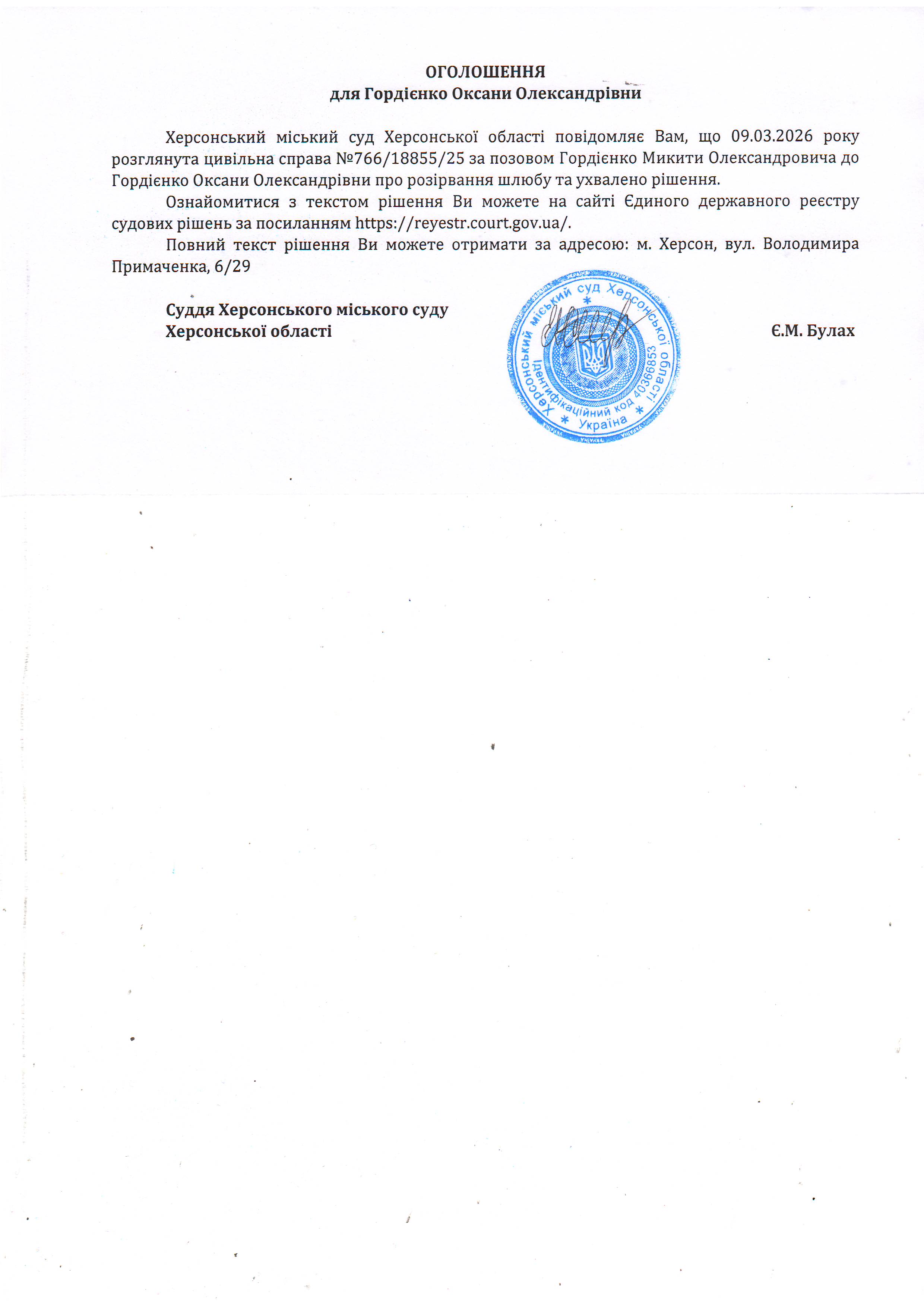 Оголошення для Гордієнко Оксани Олександрівни про ухвалення рішення