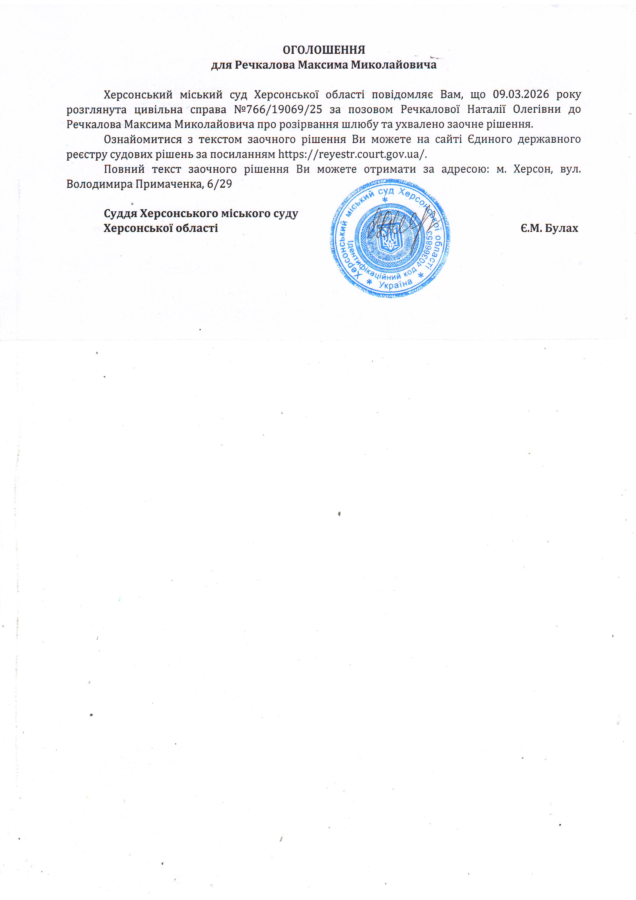 Оголошення для Речкалова Максима Миколайовича про ухвалення заочного рішення