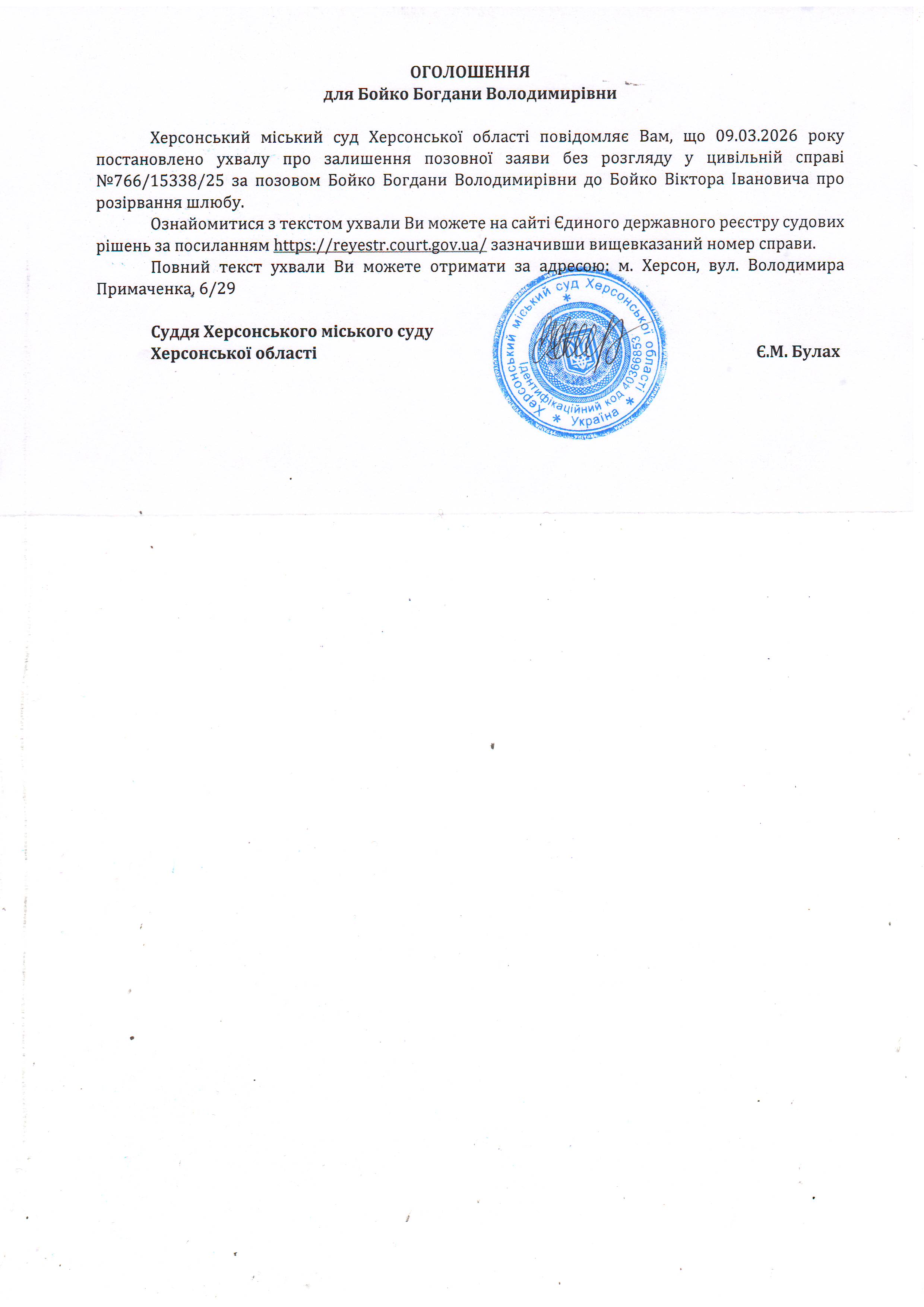 Оголошення для Бойко Богдани Володимирівни про постановлення ухвали