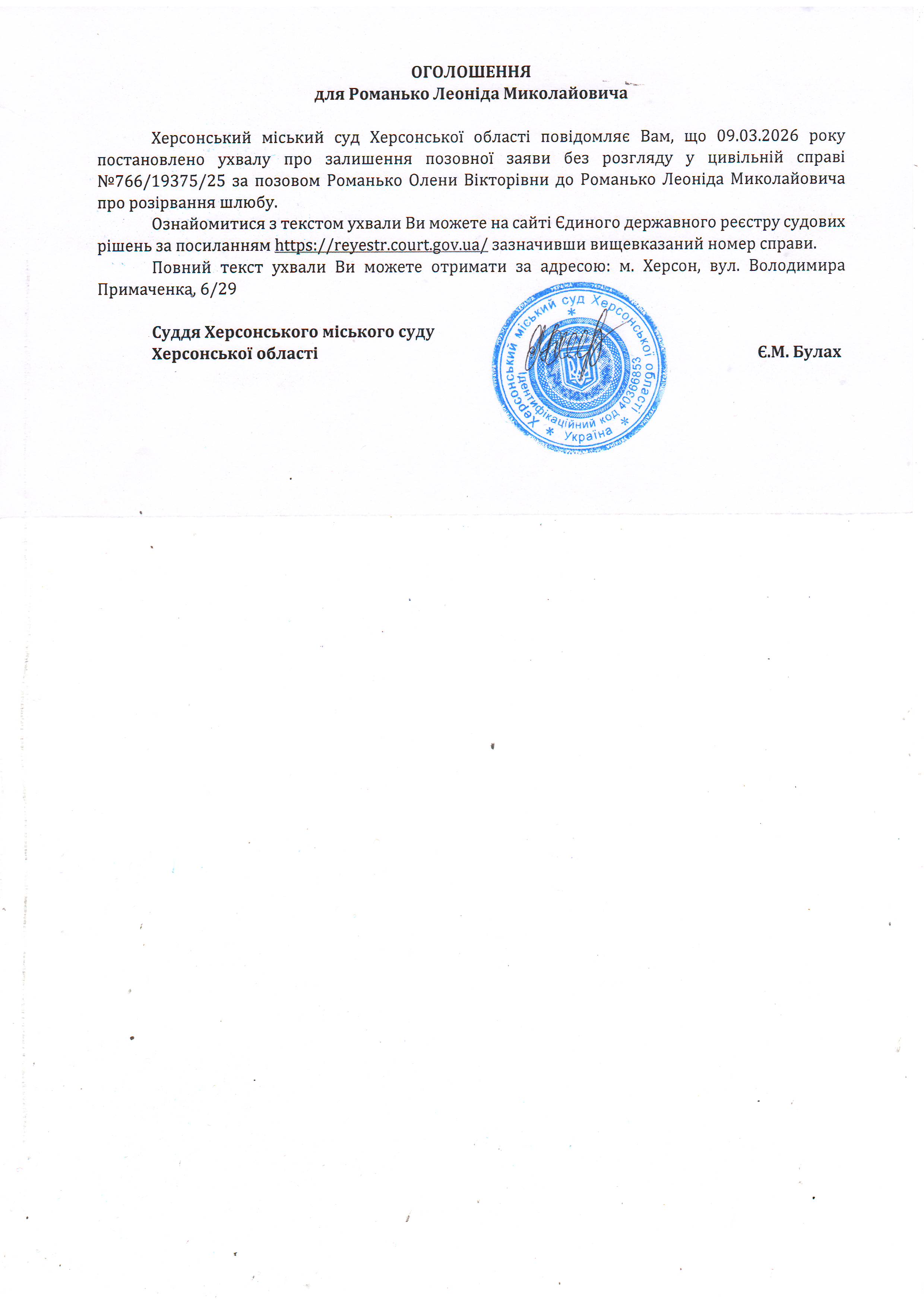 Оголошення для Романька Леоніда Миколайовича про постановлення ухвали