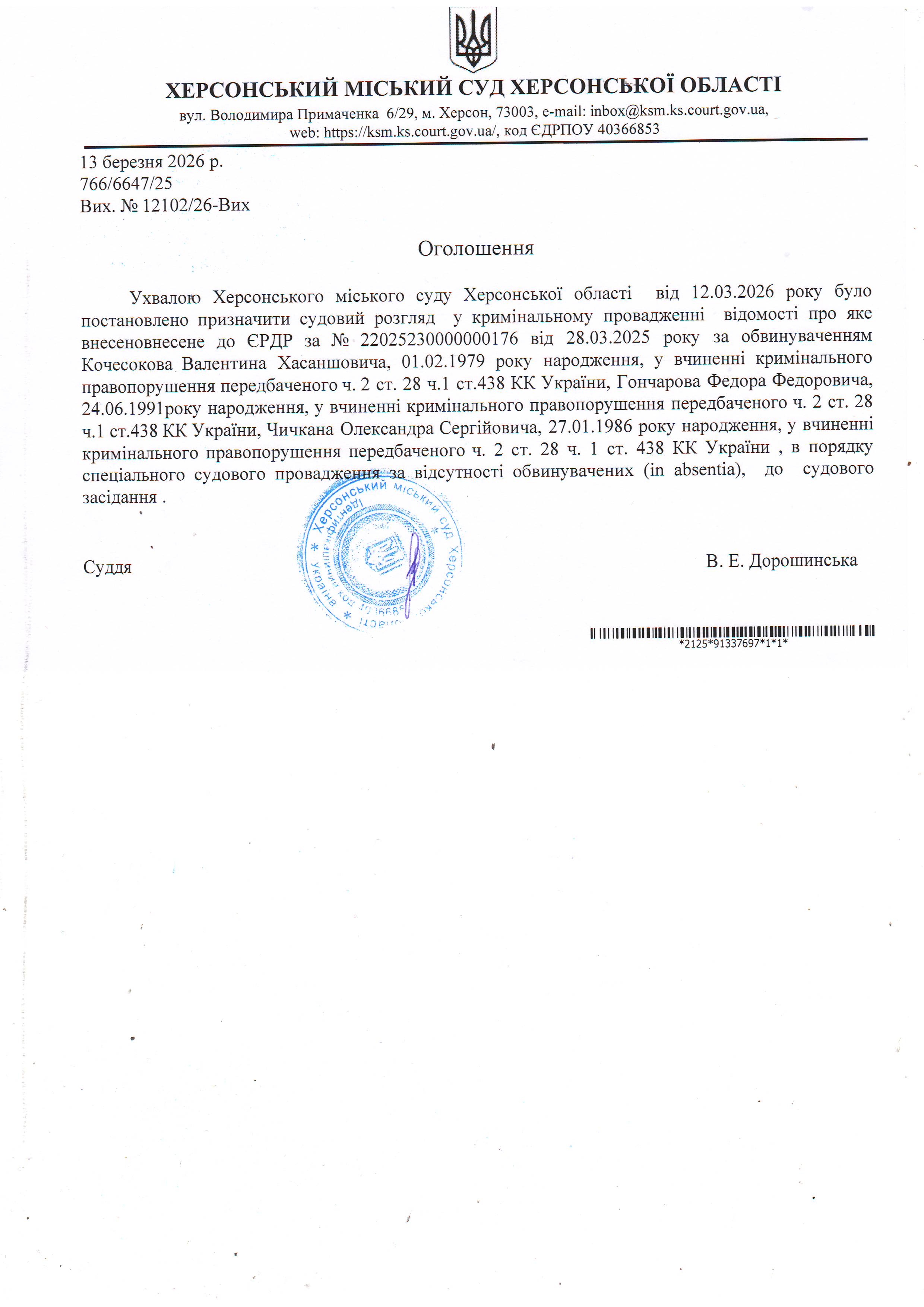Оголошення для Кочесокова Валентина Хасаншовича, Гончарова Федора Федоровича, Чичкана Олександра Сергійовича