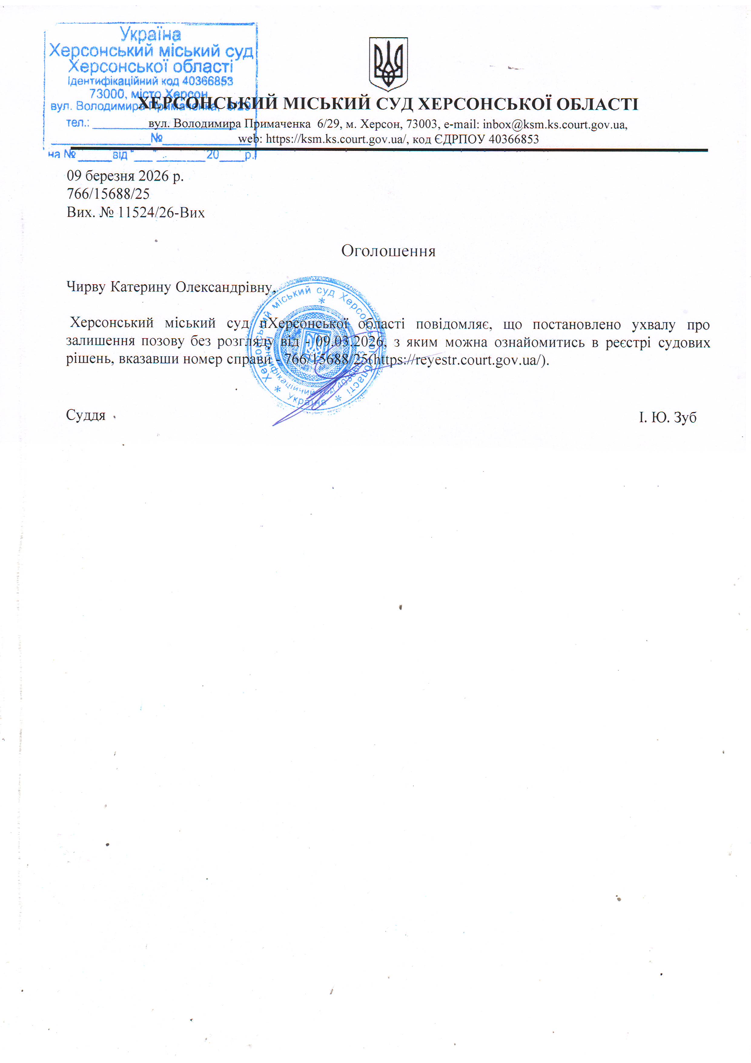 Оголошення для Чирви Катерини Олександрівни про постановлення ухвали