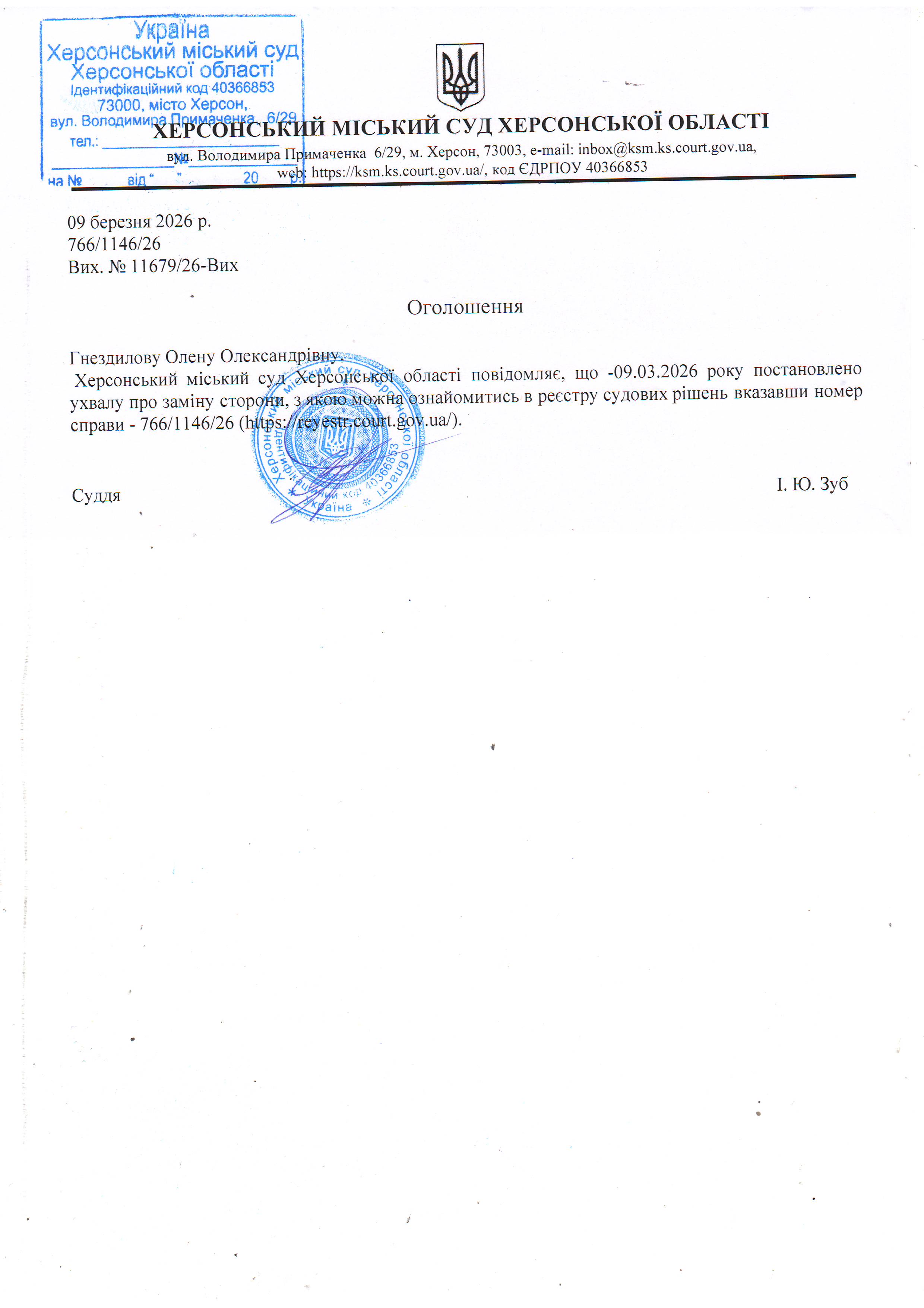 Оголошення для Гнездилової Олени Олександрівни про постановлення ухвали