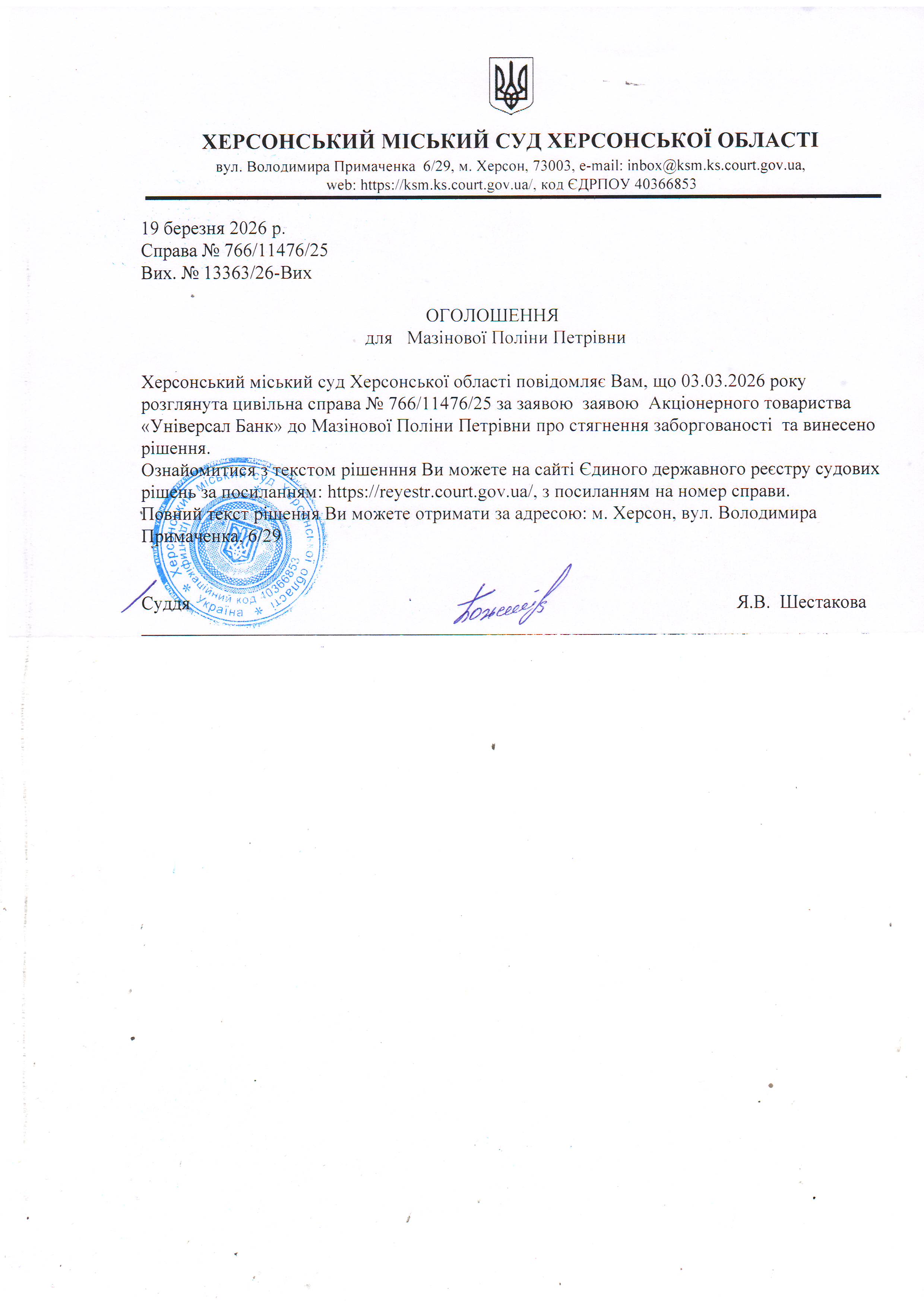 Оголошення для Мазінової Поліни Петрівни про винесення рішення