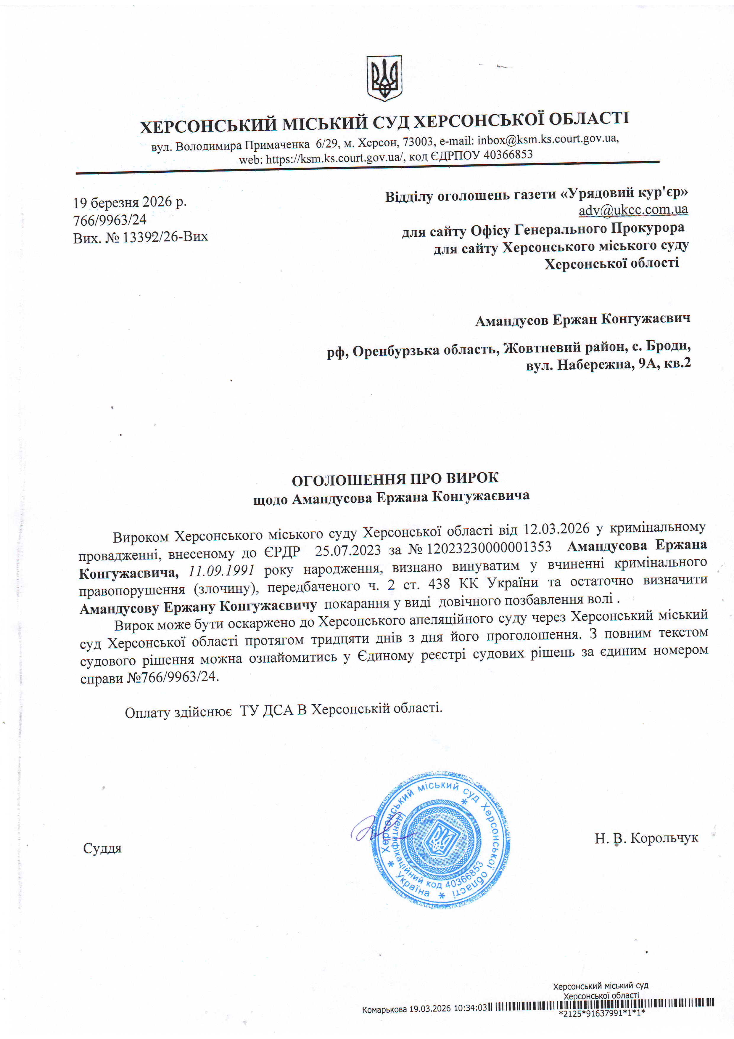Оголошення для Амандусова Ержана Конгужаєвича про винесення вироку