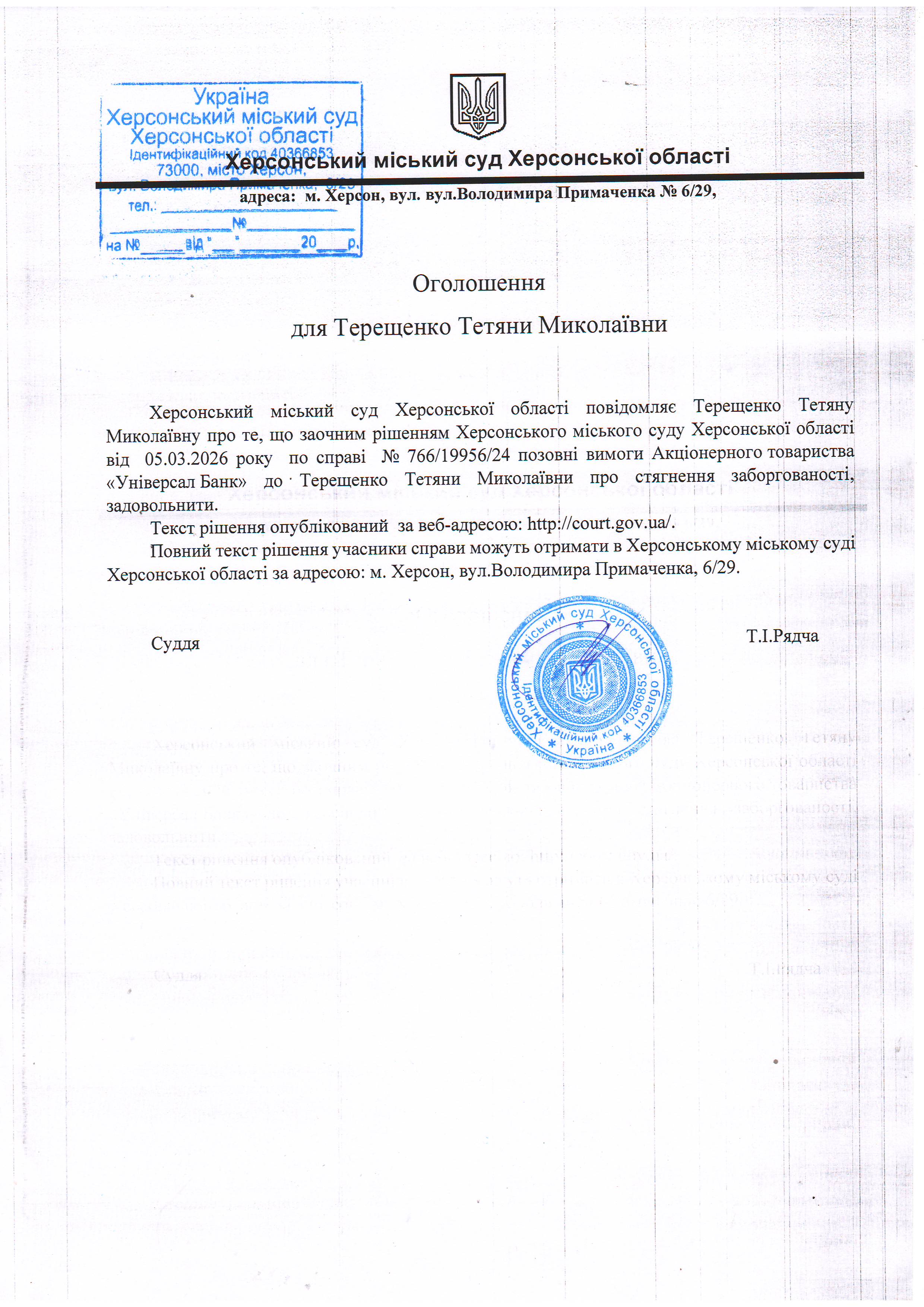 ОГОЛОШЕННЯ, УХВАЛИ ТА ЗАОЧНІ РІШЕННЯ