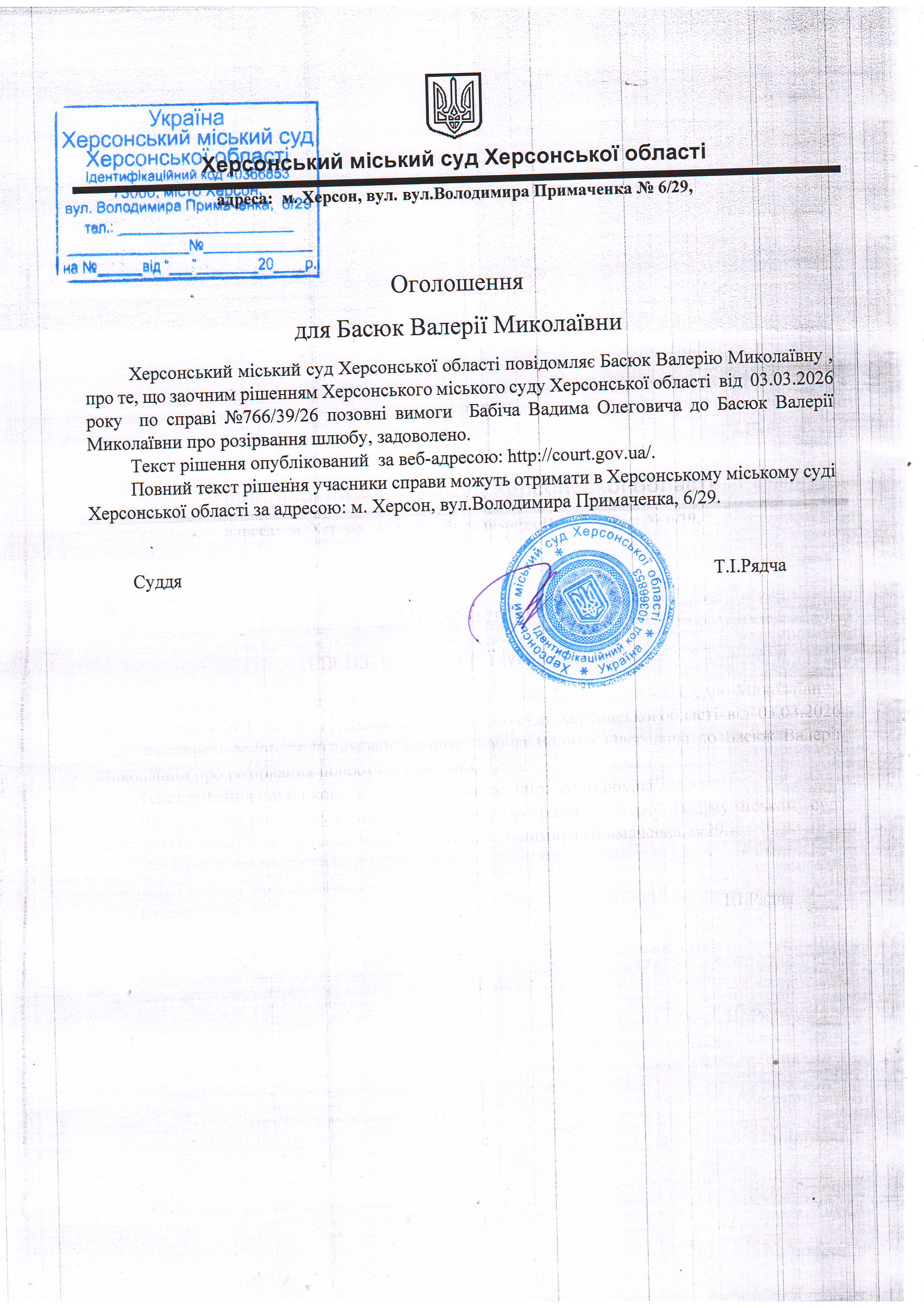 Оголошення для Басюк Валерії Миколаївни
