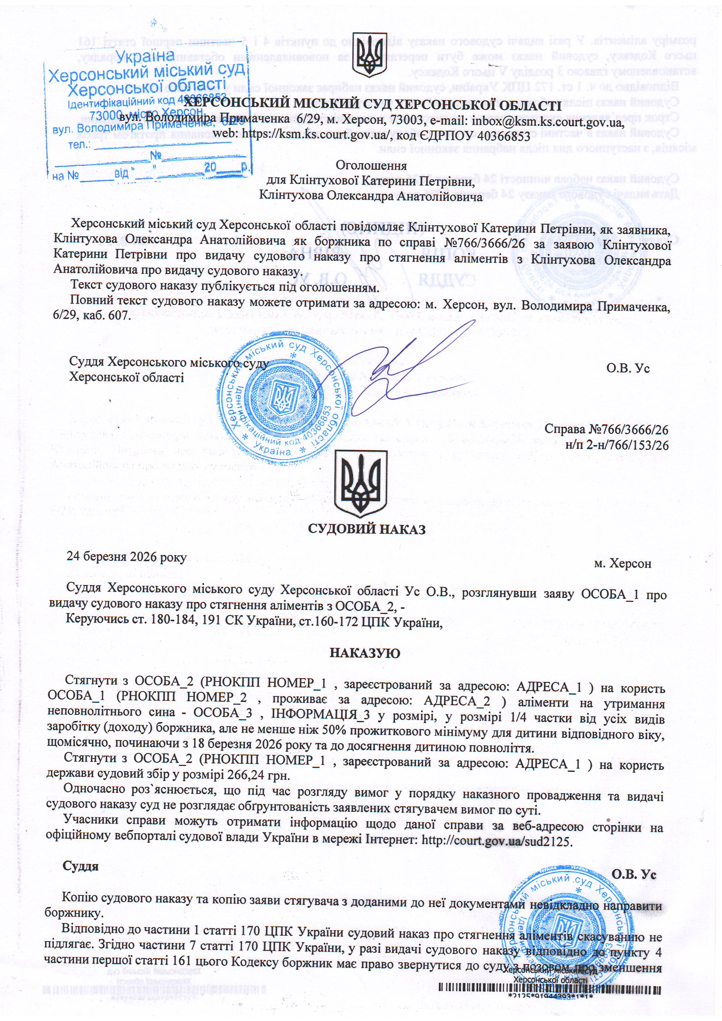 Оголошення для Клінтухової Катерини Петрівни, Клінтухова Олександра Анатолійовича