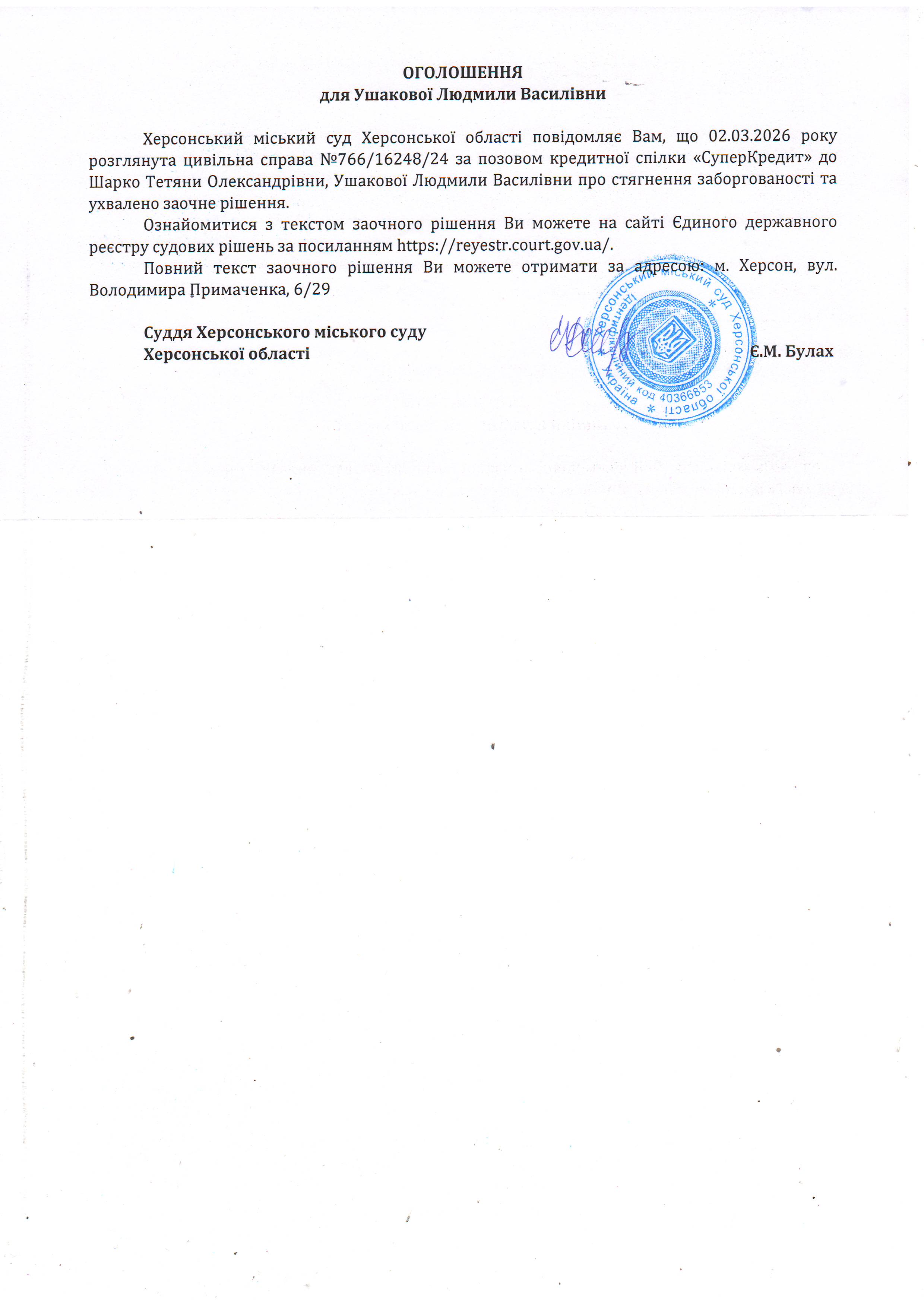 Оголошення для Ушакової Людмили Василівни про ухвалення заочного рішення