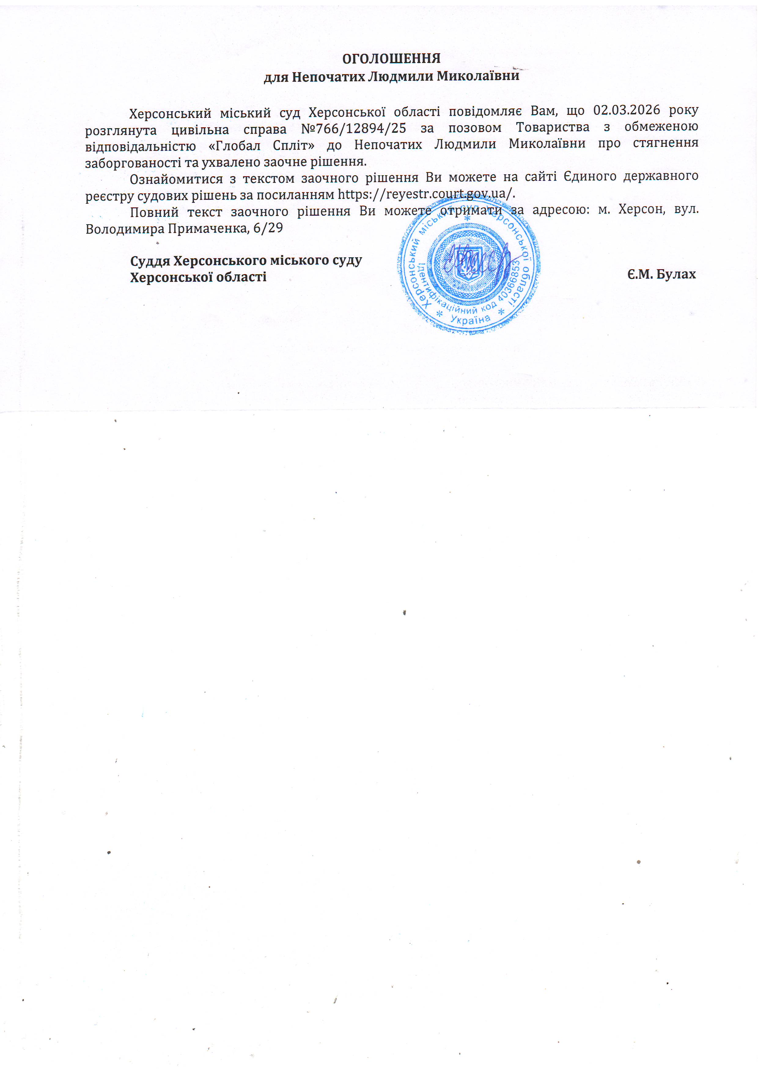 Оголошення для Непочатих Людмили Миколаївни про ухвалення заочного рішення