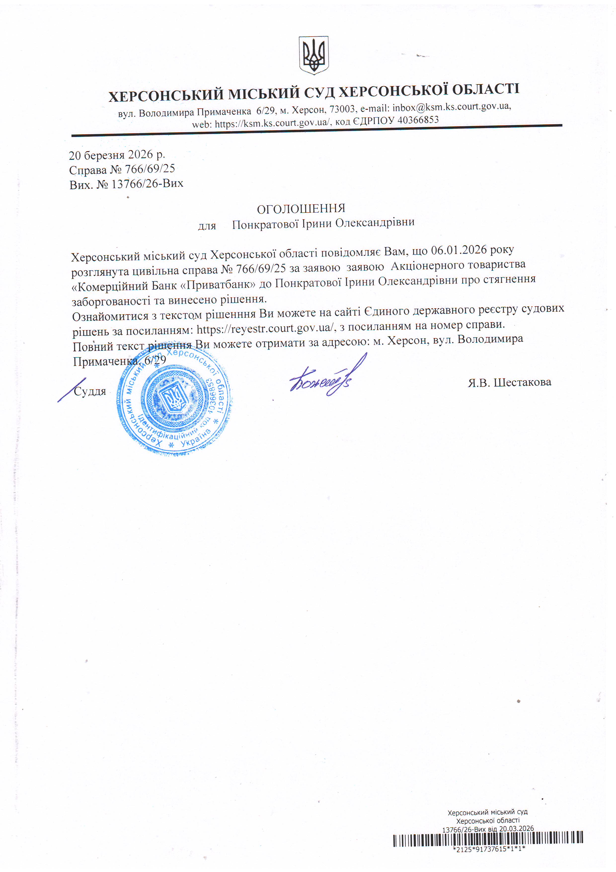 Оголошення для Понкратової Ірини Олександрівни про винесення рішення