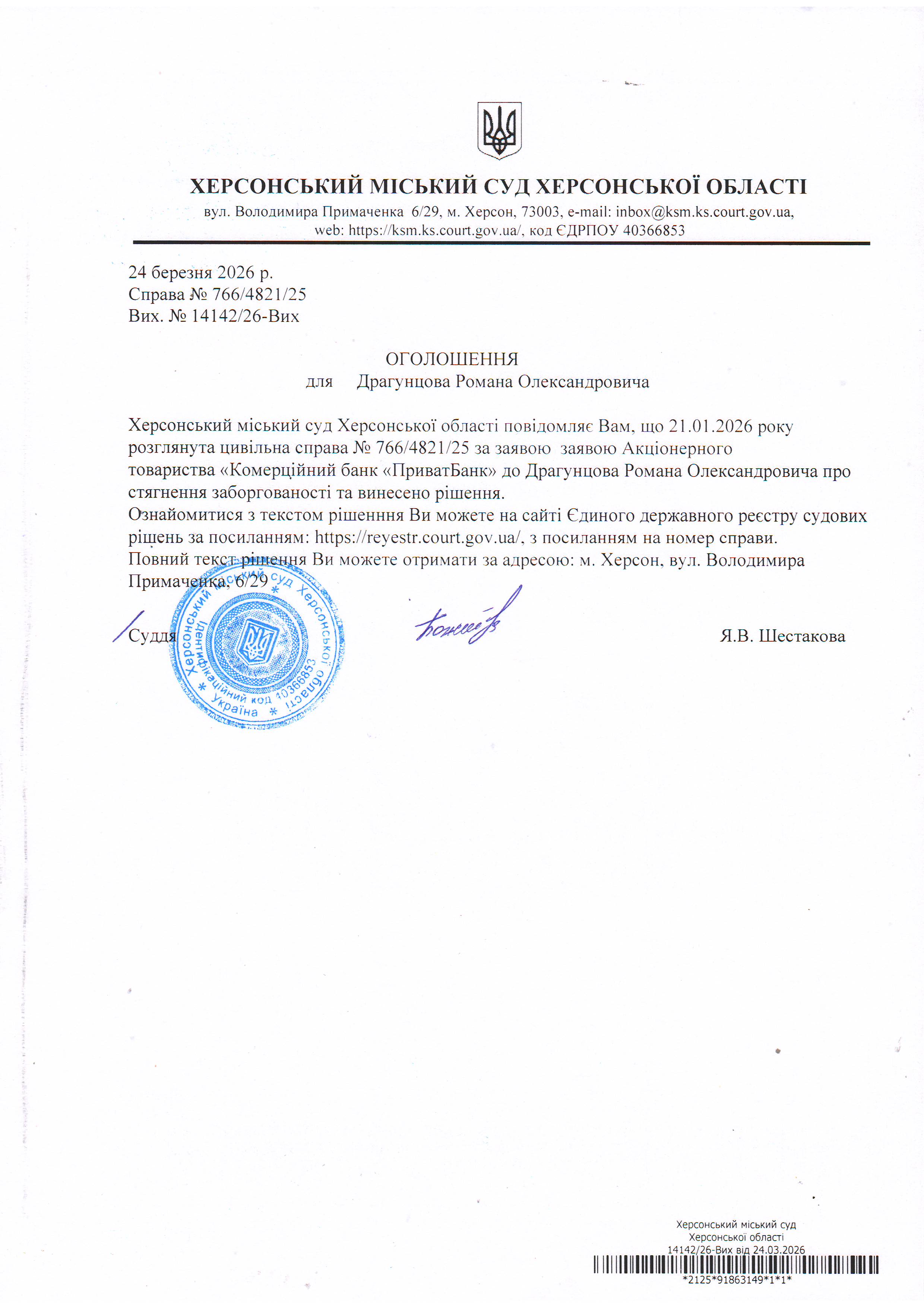 Оголошення для Драгунцова Романа Олександровича про винесення рішення