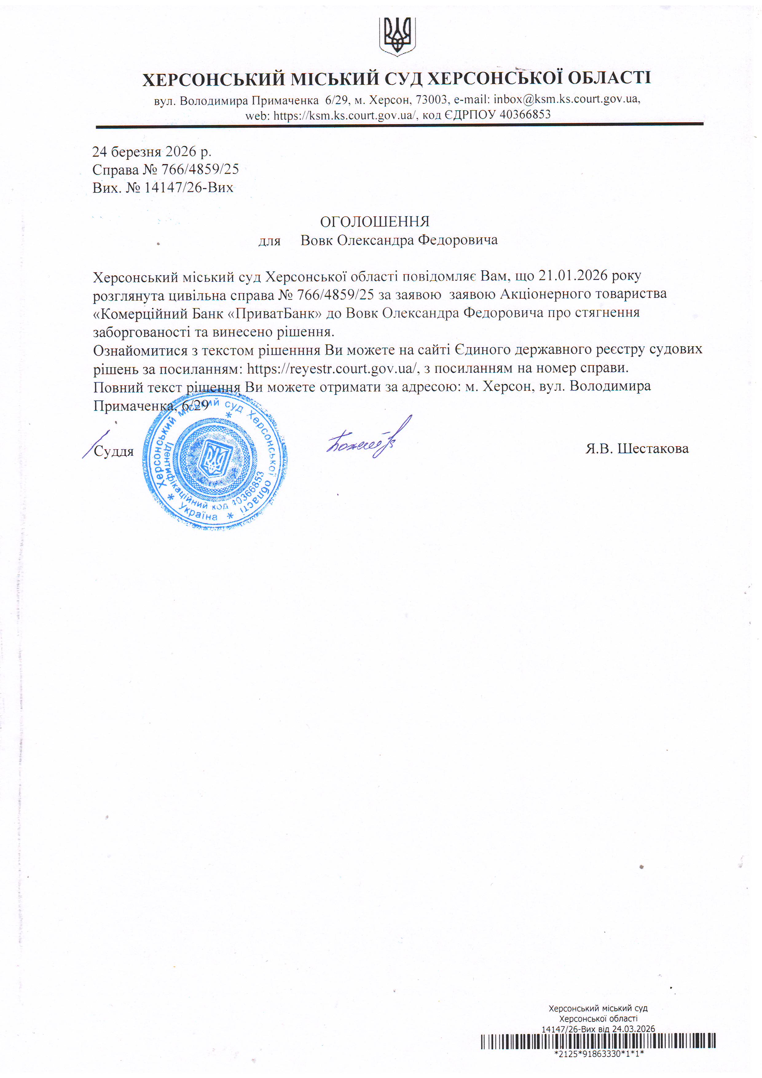 Оголошення для Вовка Олександра Федоровича про винесення рішення