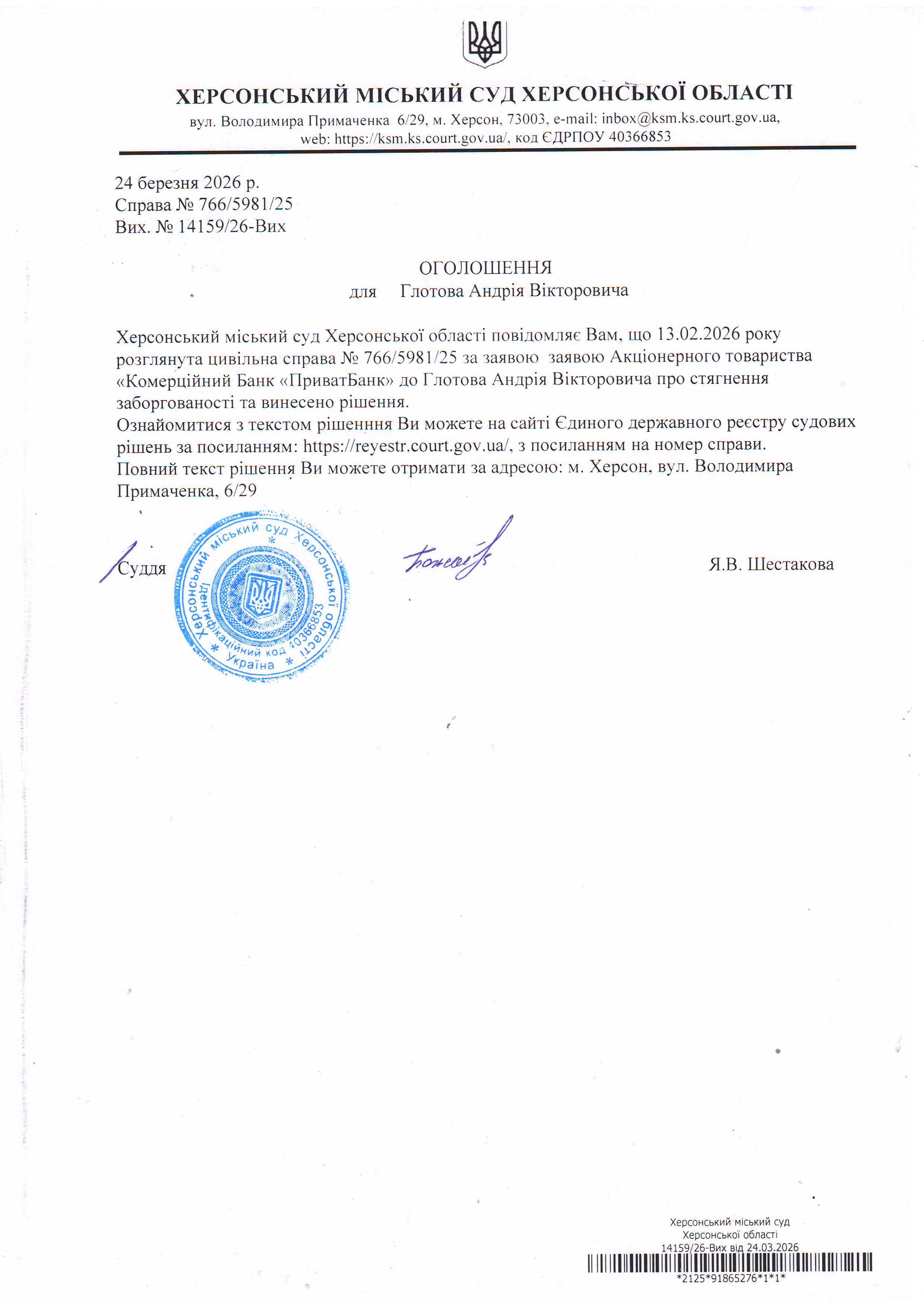 Оголошення для Глотова Андрія Вікторовича про винесення рішення