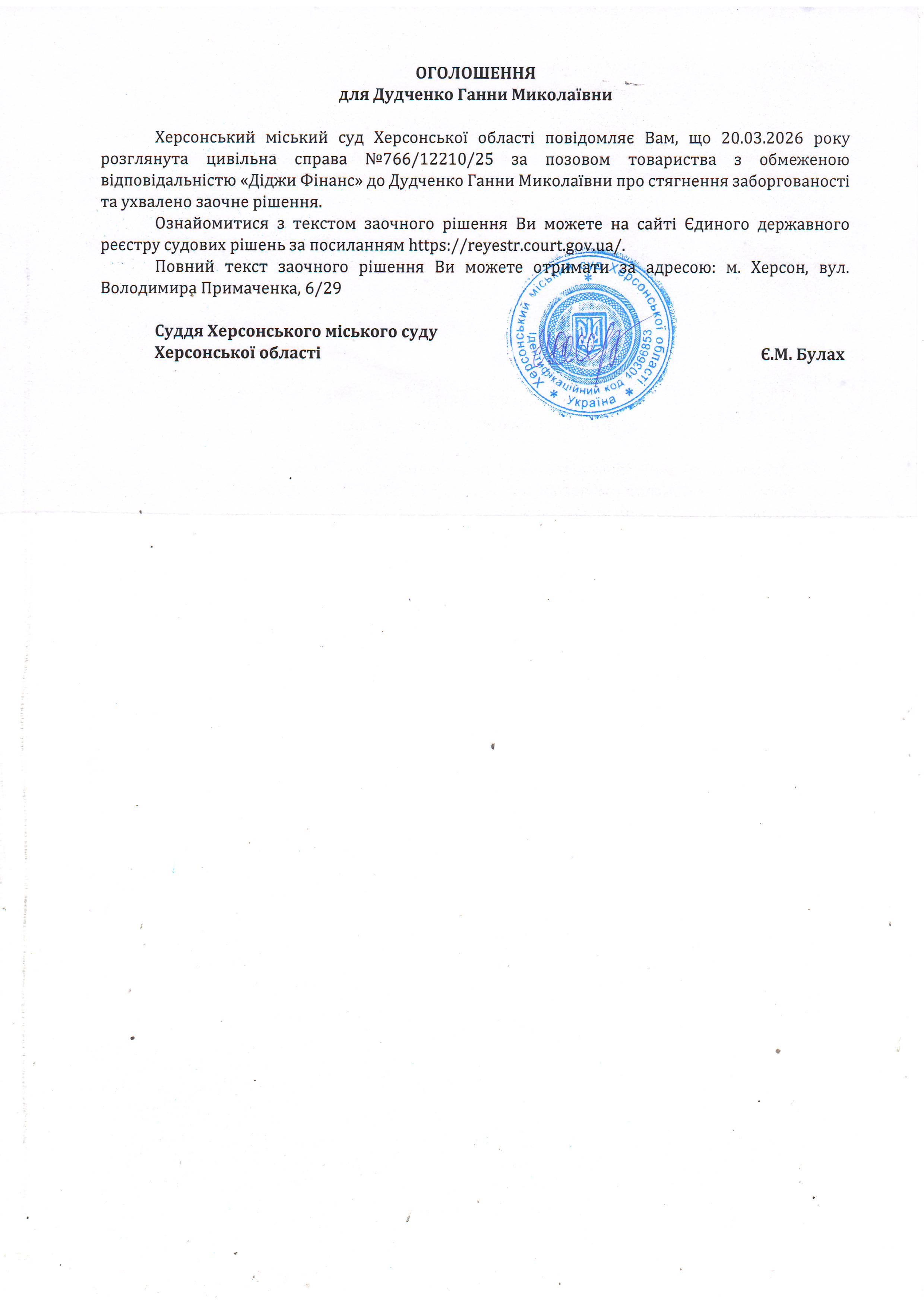 Оголошення для Дудченко Ганни Миколаївни про ухвалення заочного рішення