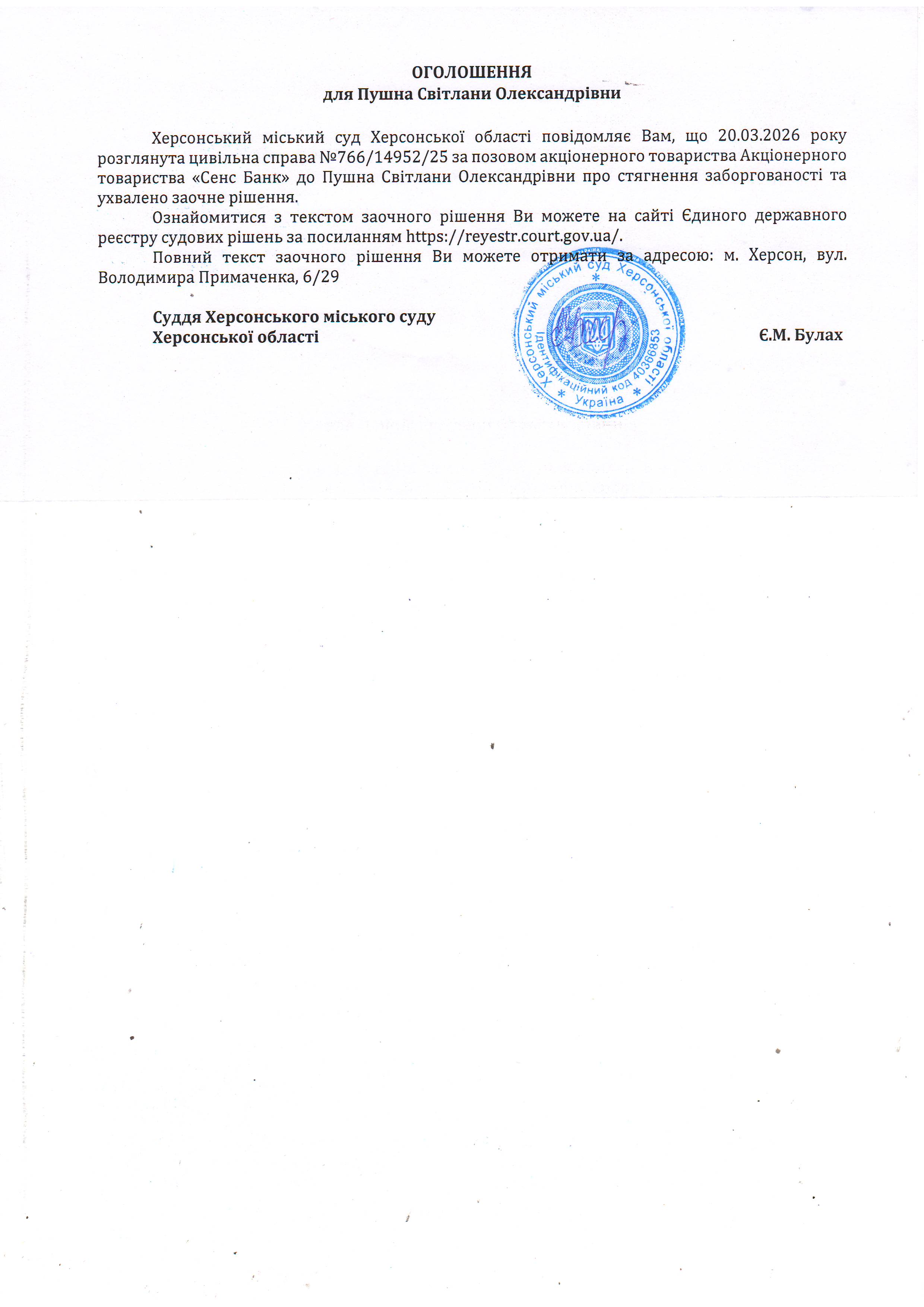 Оголошення для Пушної Світлани Олександрівни про ухвалення заочного рішення