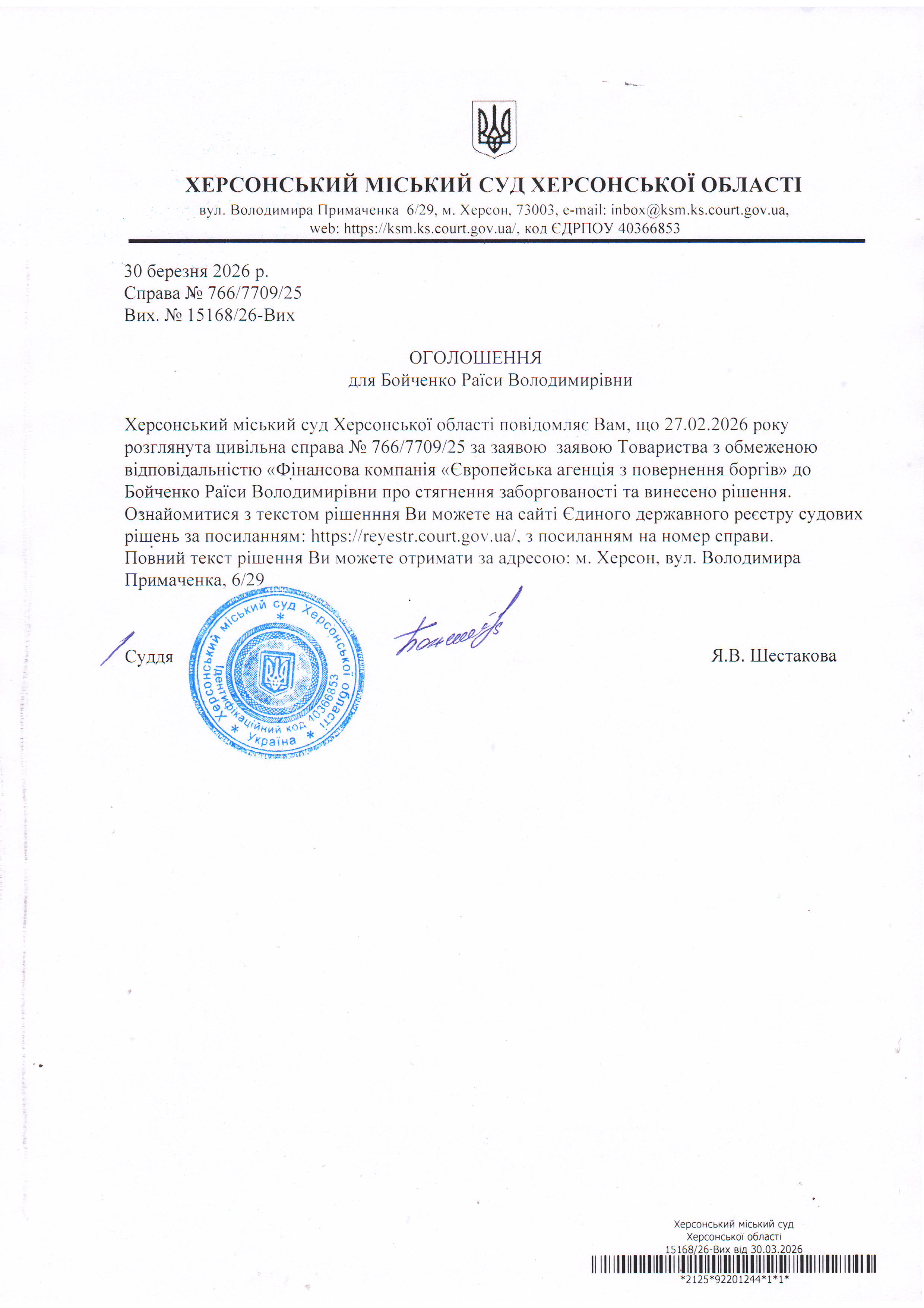 Оголошення для Бойченко Раїси Володимирівни про винесення рішення