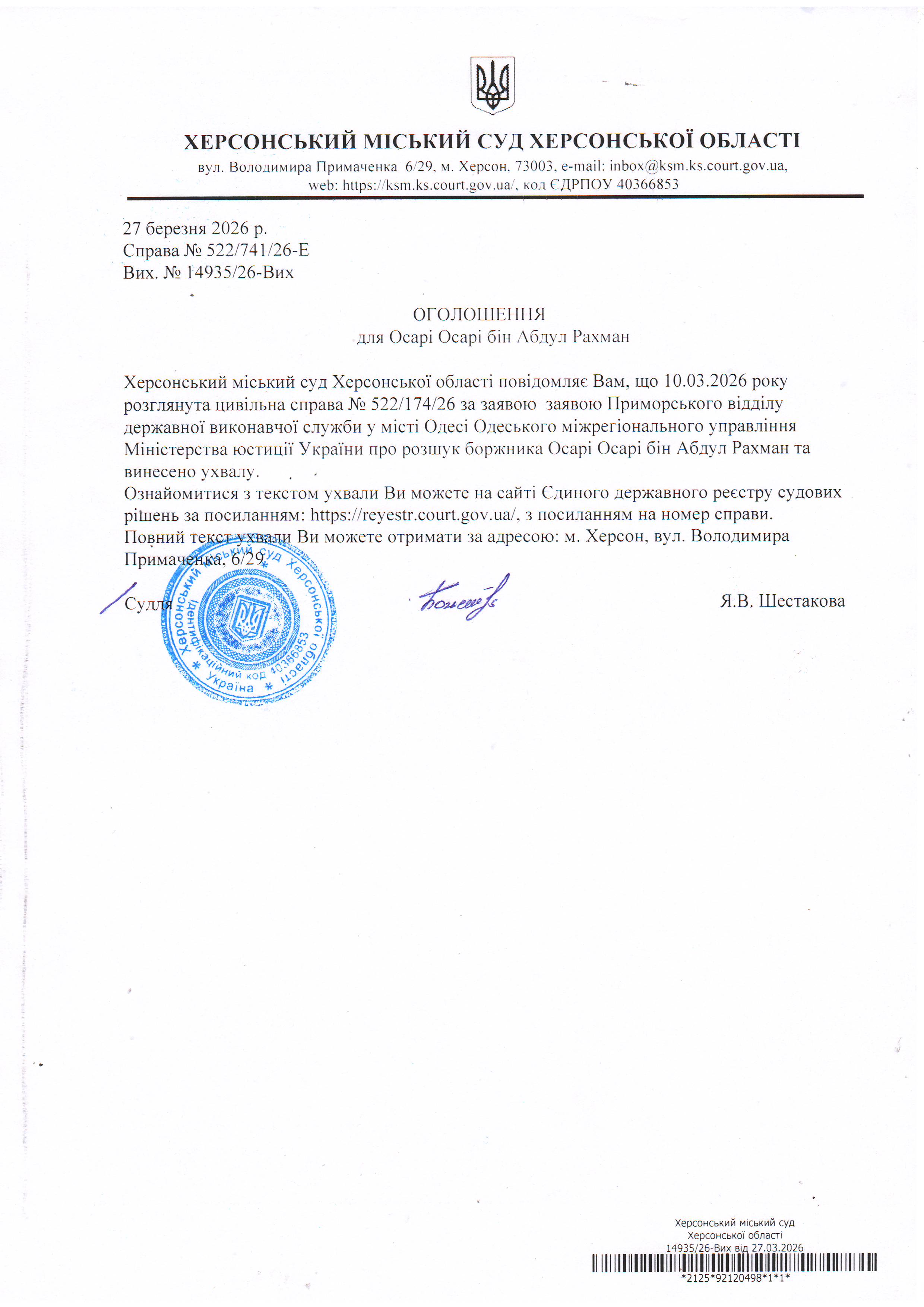 ОГОЛОШЕННЯ, УХВАЛИ ТА ЗАОЧНІ РІШЕННЯ