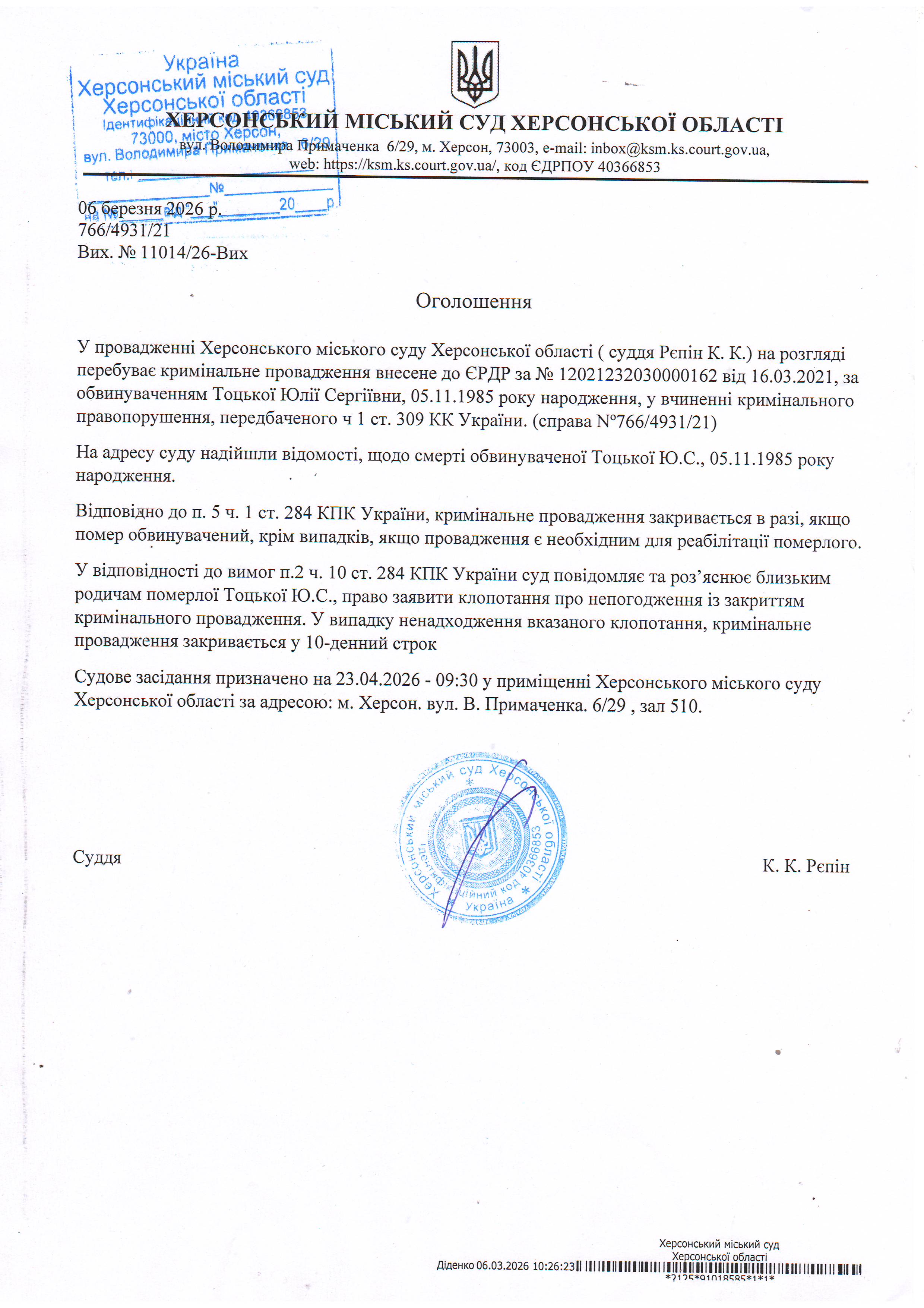 Оголошення про закриття кримінального провадження у відношенні Тоцької Юлії Сергіївни