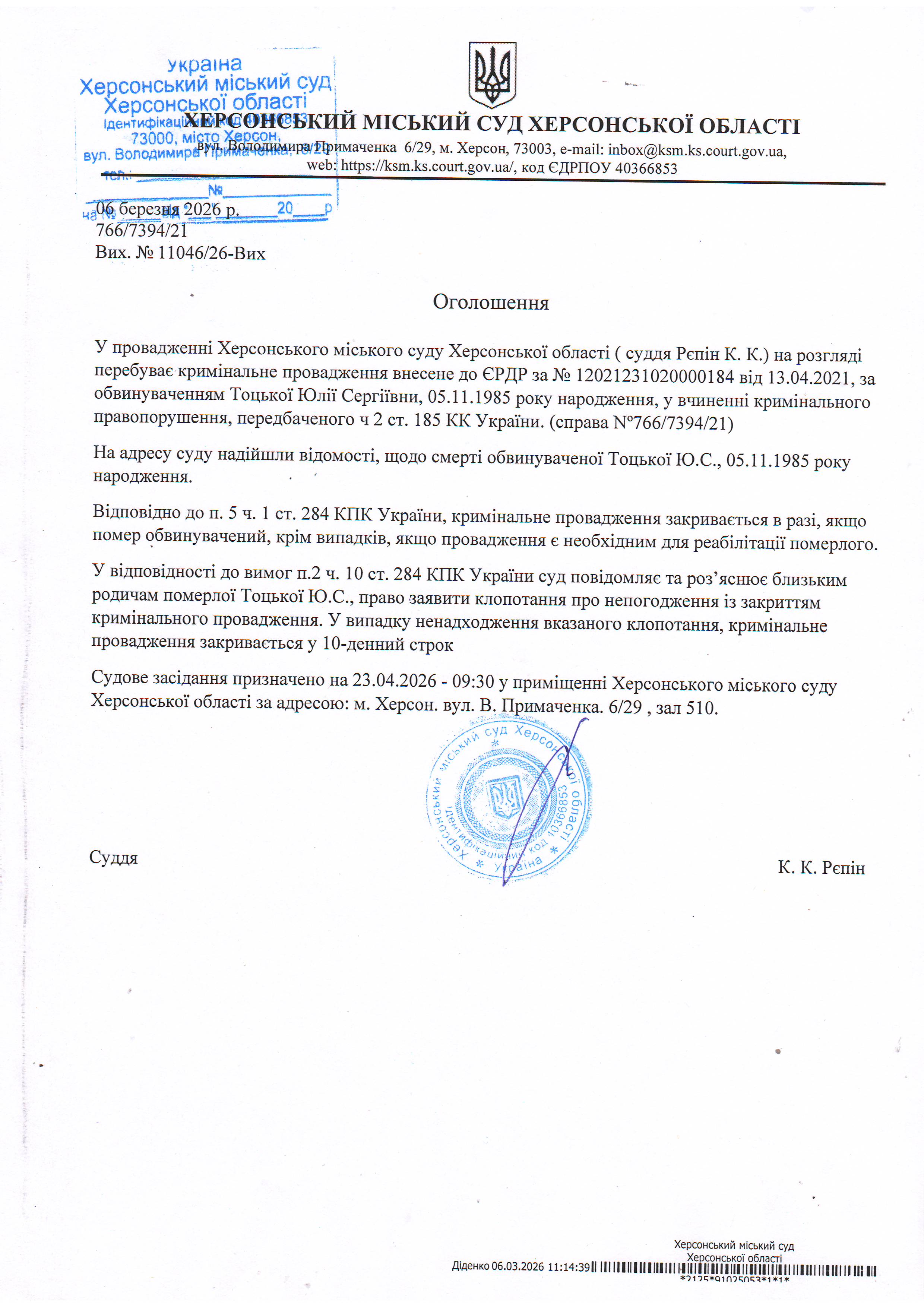 Оголошення про закриття кримінального провадження у відношенні Тоцької Юлії Сергіївни