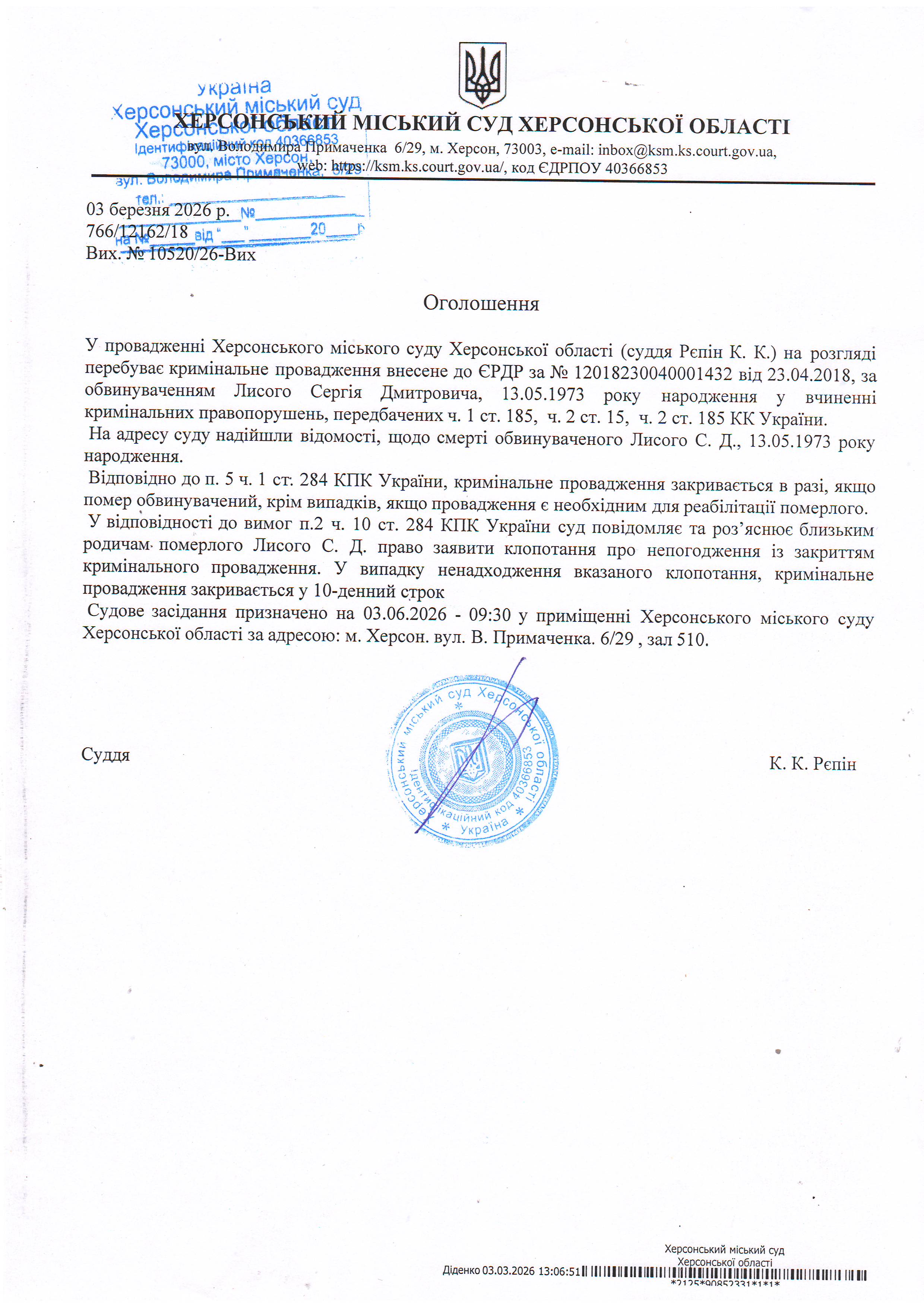 Оголошення про закриття кримінального провадження у відношенні Лисого Сергія Дмитровича