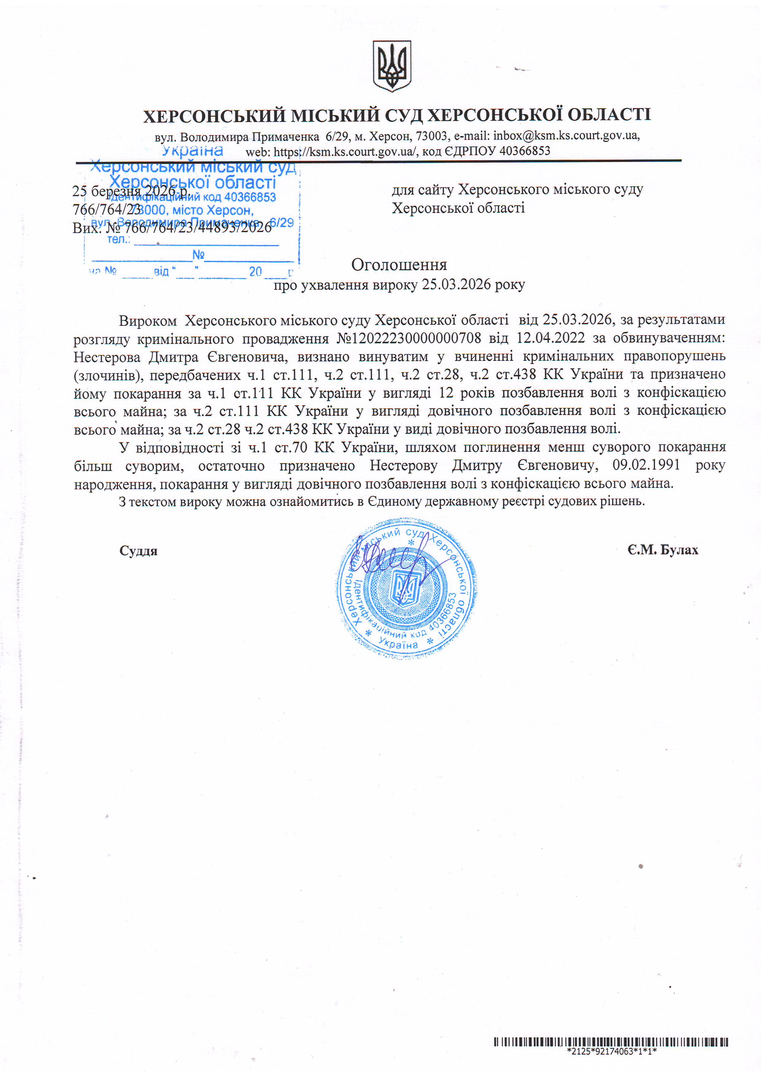 Оголошення для Нестерова Дмитра Євгенійовича про ухвалення вироку