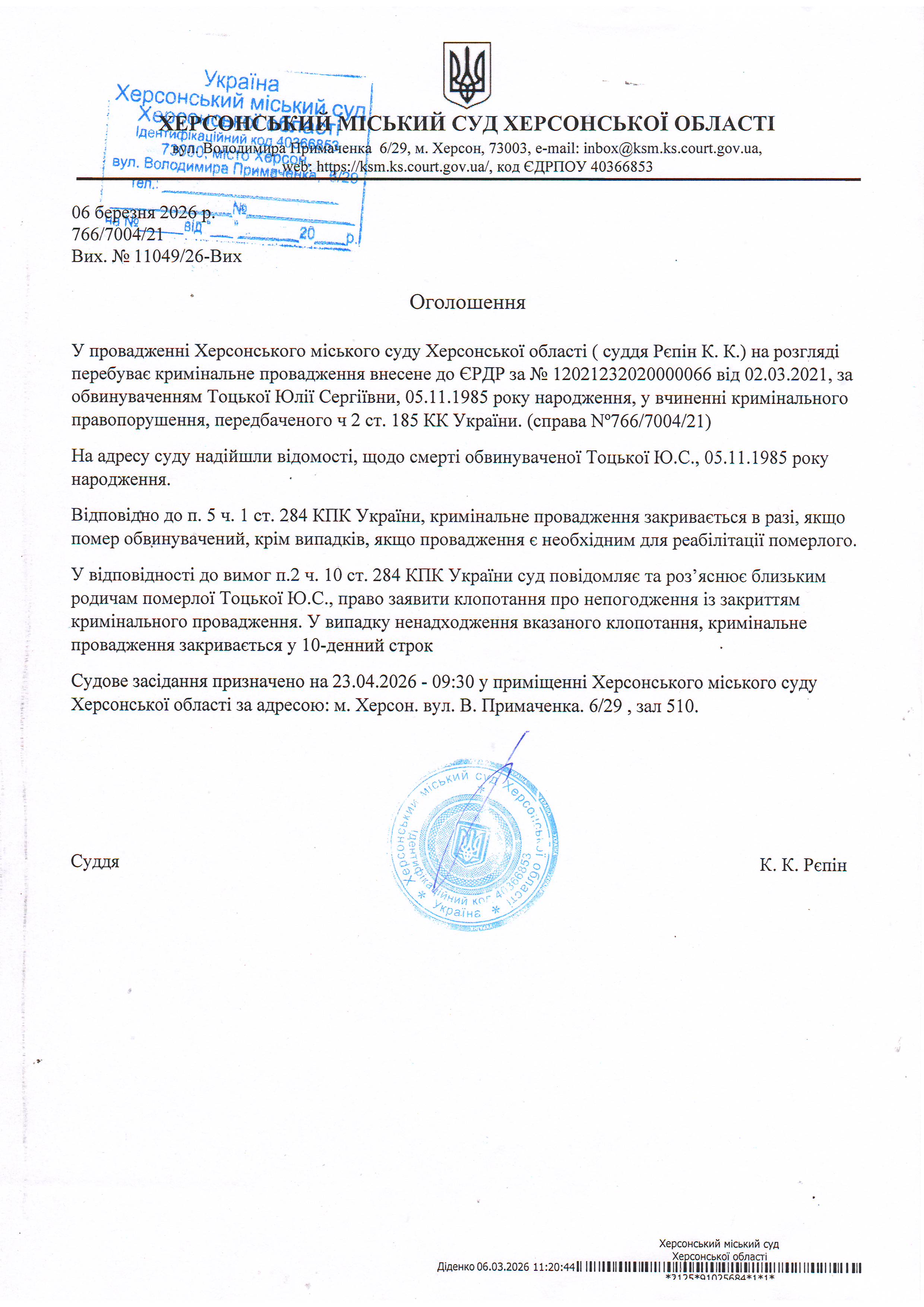 Оголошення про закриття кримінального провадження у відношенні Тоцької Юлії Сергіївни