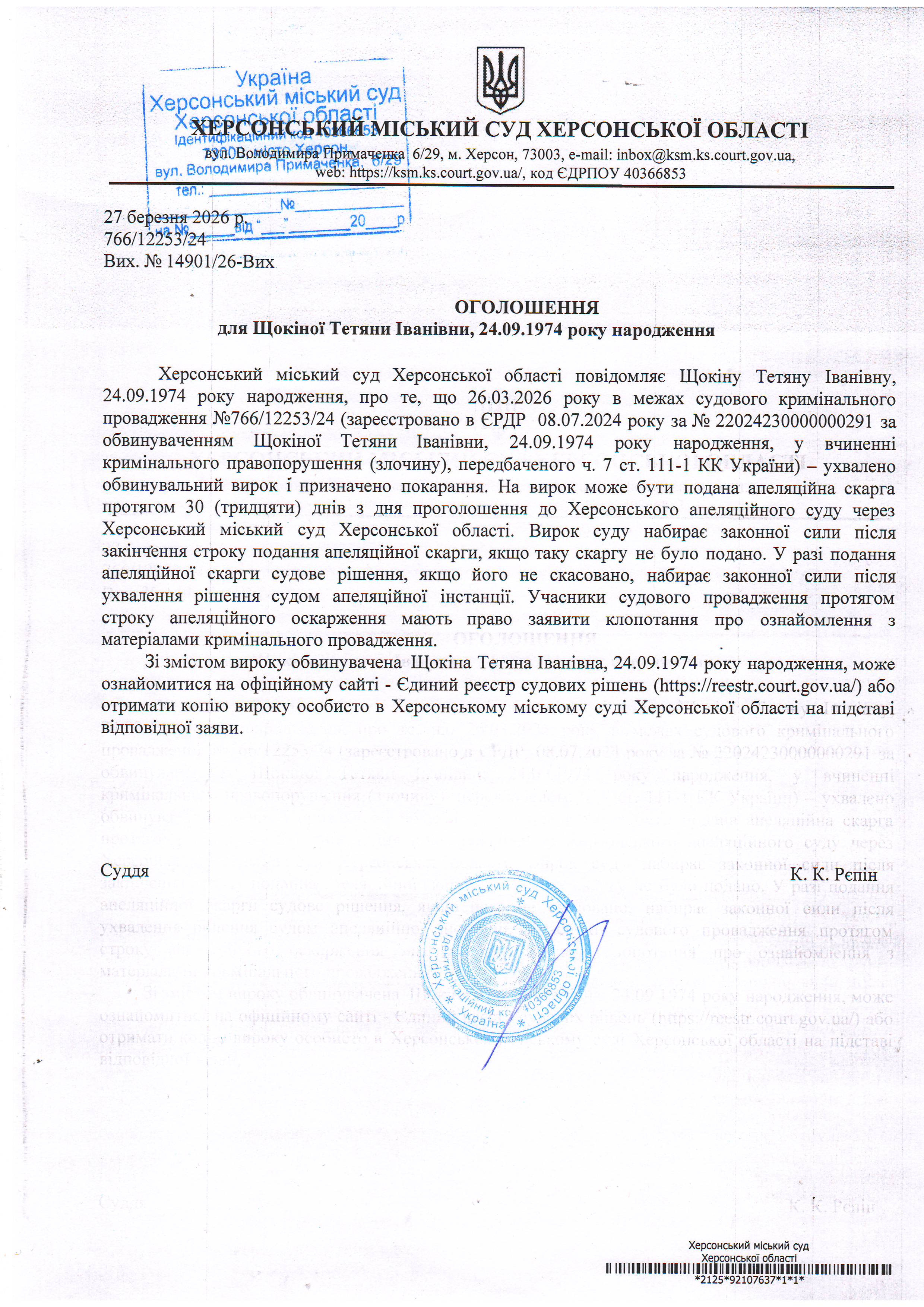 Оголошення для Щокіної Тетяни Іванівни про винесення вироку